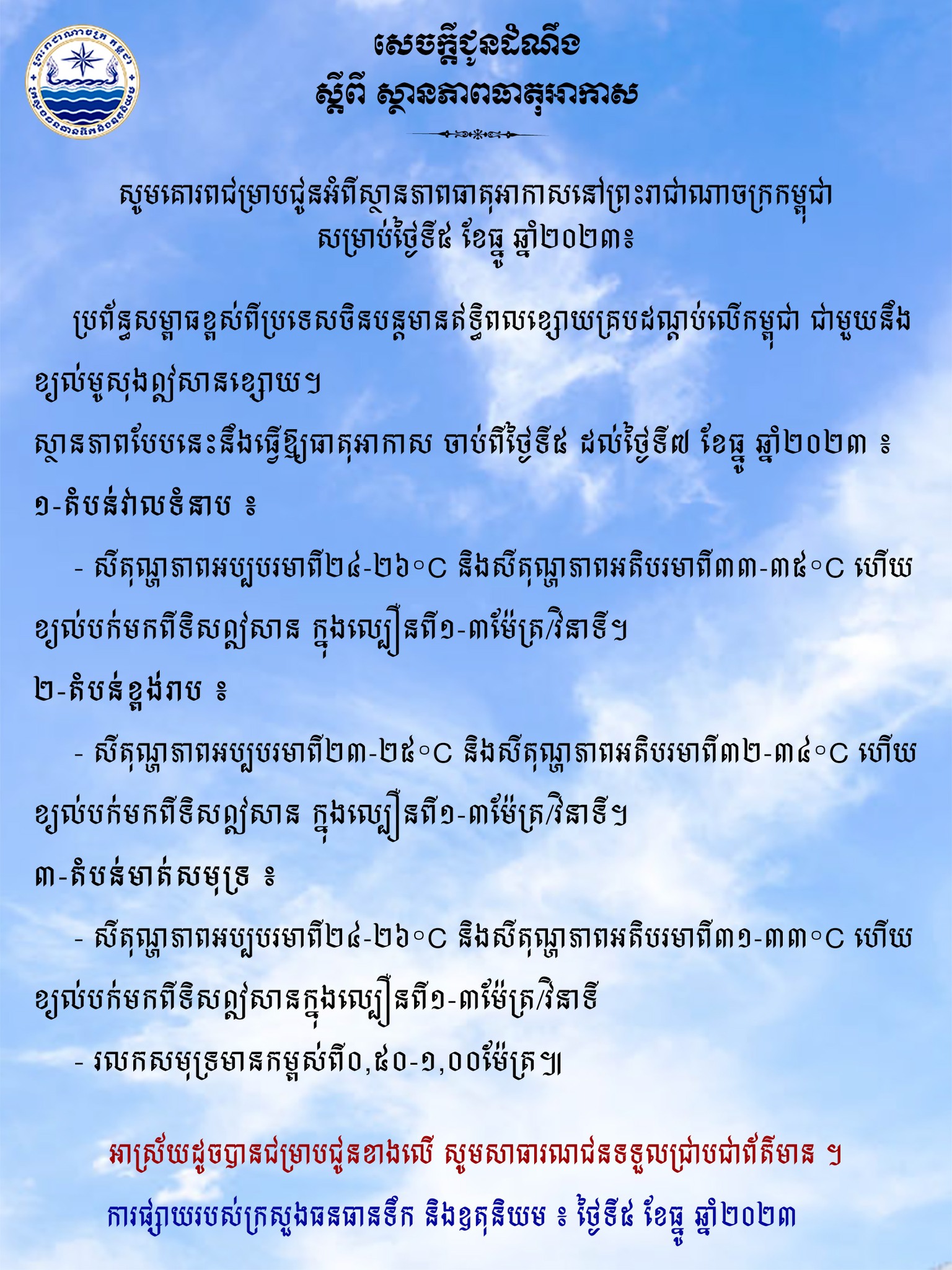 ក្រសួងធនធានទឹកជូនដំណឹងពីស្ថានភាពធាតុអាកាសនៅកម្ពុជាសម្រាប់ថ្ងៃទី៥ ខែធ្នូ ឆ្នាំ២០២៣
