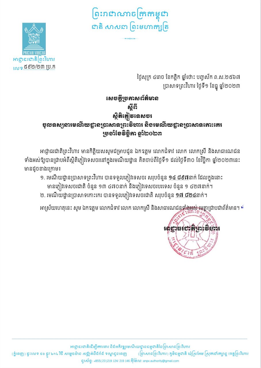 ខេត្តព្រះវិហារ៖ រយៈពេល ១ខែពេញនៃខែវិច្ឆិកា រមណីយដ្ឋានប្រាសាទព្រះវិហារ និងរមណីយដ្ឋានប្រាសាទកោះកេរទទួលបានភ្ញៀវទេសចរសរុបជាង៣ម៉ឺននាក់។