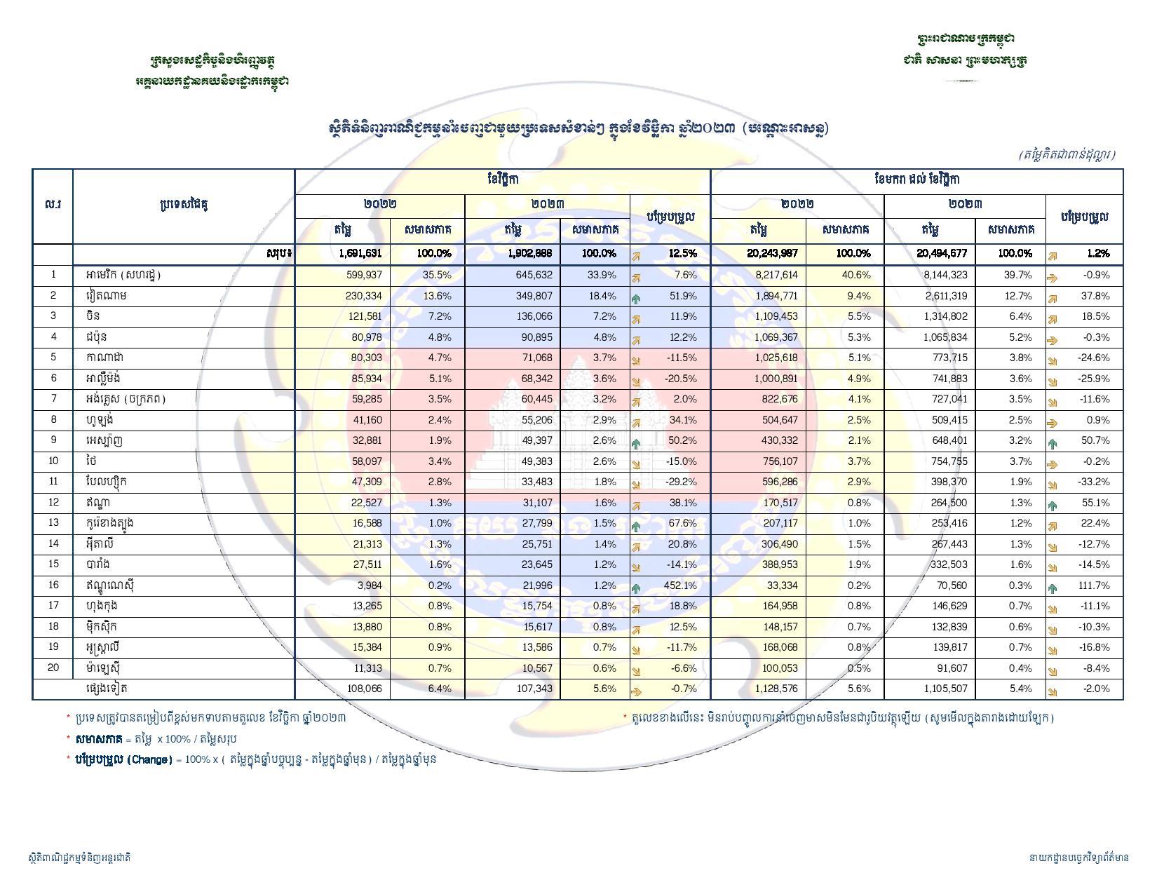 របាយការណ៍នាំចេញនាំចូលទំនិញ របស់អគ្គនាយកដ្ឋានគយ និងរដ្ឋាករកម្ពុជា បានបញ្ជាក់ថា ចាប់ពីខែមករា ដល់ខែវិច្ឆិកា ឆ្នាំ២០២៣ ទំហំពាណិជ្ជកម្មរបស់កម្ពុជាជាមួយអន្តរជាតិ សម្រាប់បានទឹកប្រាក់ ៤២ ៥០០លានដុល្លារ ក្នុងនោះកម្ពុជានាំចេញមានទឹកប្រាក់ ២០ ៤៩៤ លានដុល្លារ កើនឡើង ១.២ភាគរយ ខណនាំចូលវិញមានទឹកប្រាក់ ២២ ០០៦លានដុល្លារ ធ្លាក់ចុះ៥.៤ភាគរយ ។