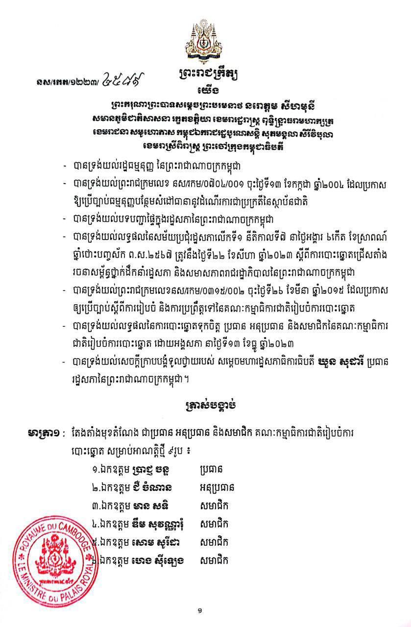 ព្រះមហាក្សត្រចេញព្រះរាជក្រឹត្យត្រាស់បង្គាប់តែងតាំងឯកឧត្តម ប្រាជ្ញ ចន្ទ ជាប្រធាន គ.ជ.ប សម្រាប់អាណត្តិថ្មី អមជាមួយអនុប្រធាន សមាជិកចំនួន៩រូប