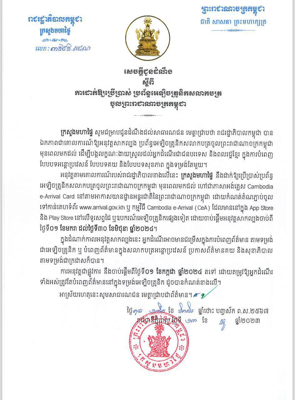 សេចក្ដីជូនដំណឹង បានឲ្យដឹងថា រាជរដ្ឋាភិបាលកម្ពុជា បានឯកភាពជាគោលការណ៍ ឲ្យអនុវត្តសាកល្បង ប្រព័ន្ធអេឡិចត្រូនិកសលាកបត្រ ចូលព្រះរាជាណាចក្រកម្ពុជាមុនពេលមកដល់ ដើម្បីបង្កលក្ខណៈងាយស្រួល ដល់អ្នកដំណើរជាជនបរទេស និងពលរដ្ឋខ្មែរ ក្នុងការបំពេញបែបបទអន្តោប្រវេសន៍ បែបបទគយ និងបែបបទសុខភាព ក្នុងទម្រង់តែមួយ៕