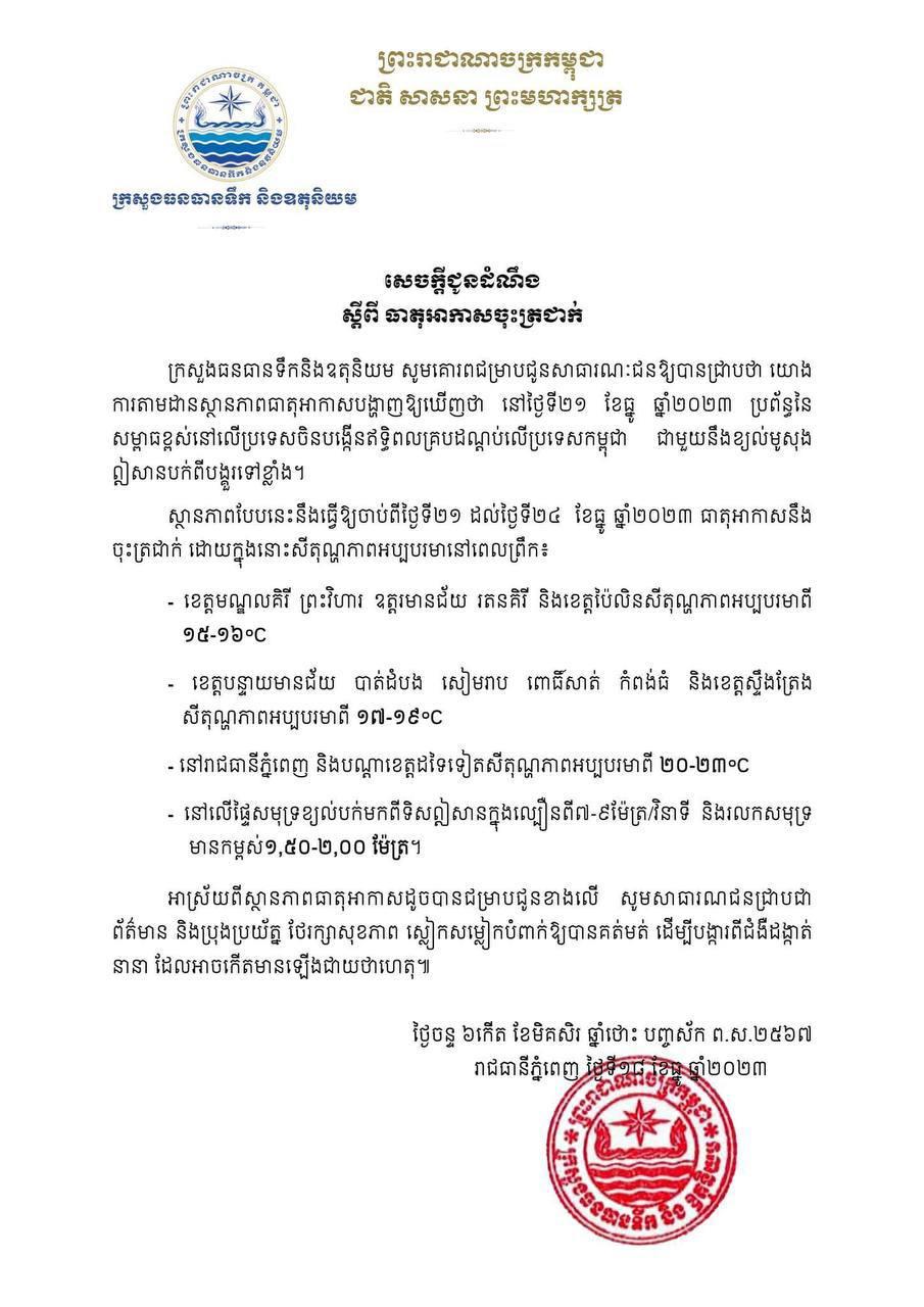 សេចក្តីជូនដំណឹងនេះ បានបញ្ជាក់ថា នៅថ្ងៃទី២១ ខែធ្នូ ឆ្នាំ២០២៣ ប្រព័ន្ធនៃសម្ពាធខ្ពស់នៅលើប្រទេសចិនបង្កើនឥទ្ធិពលគ្របដណ្តប់លើប្រទេសកម្ពុជា ជាមួយនឹងខ្យល់មូសុងឦសានបក់ពីបង្គួរទៅខ្លាំង។ ស្ថានភាពបែបនេះនឹងធ្វើឱ្យ ចាប់ពីថ្ងៃទី២១ ដល់ថ្ងៃទី២៤ ខែធ្នូ ឆ្នាំ២០២៣ ធាតុអាកាសនឹងចុះត្រជាក់ ដោយក្នុងនោះសីតុណ្ហភាពអប្បបរមានៅពេលព្រឹក៖