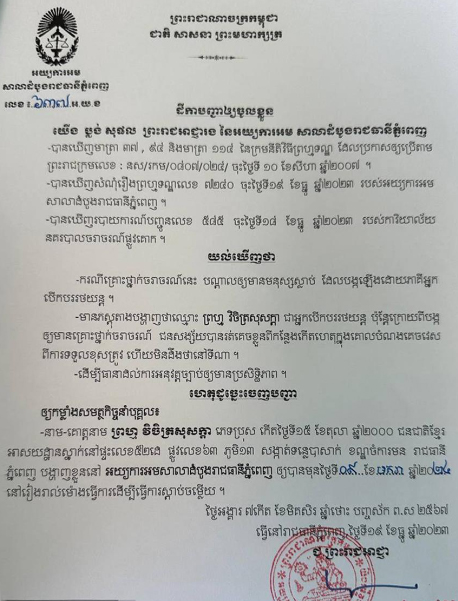 តាមរយៈដីកា តំណាងអយ្យការអមសាលាដំបូងរាជធានីភ្នំពេញ បានកំណត់ឲ្យជនបង្កឈ្មោះ ព្រហ្ម វិចិត្រសុសក្ដា អាយុ២៣ឆ្នាំ បង្ហាញខ្លួននៅតុលាការឲ្យបានមុនថ្ងៃទី០៩ ខែមករា ឆ្នាំ២០២៤ នៅរៀងរាល់ម៉ោងធ្វើការ។ ក្នុងដីកាដដែលនេះ ក៏បានកត់សម្គាល់ថា ដីកានេះអនុញ្ញាតឲ្យមន្ដ្រីនគរបាលយុត្តិធម៌ប្រើប្រាស់កម្លាំងសាធារណៈ ដើម្បីបង្ខំឲ្យបុគ្គល ព្រហ្ម វិចិត្រសុសក្ដា ចូលបង្ហាញខ្លួនបាន។