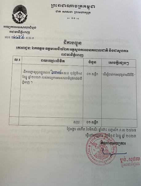 លោក ជិន ម៉ាលីន អ្នកនាំពាក្យក្រសួងយុត្តិធម៌ នៅថ្ងៃទី១៩ធ្នូនេះ បានបញ្ជាក់ថា៖ ស្ថាប័នអយ្យការបានចេញដីកាបញ្ជាឱ្យចូលខ្លួន បង្គាប់ឱ្យជនសង្ស័យបង្ហាញខ្លូននៅអយ្យការអមសាលាដំបូងរាជធានីភ្នំពេញ ឱ្យបានមុនថ្ងៃទី០៩ ខែមករា ឆ្នាំ២០២៤។ ដីកាបញ្ជាឱ្យចូលខ្លួននេះ ក៏មានអនុភាពបញ្ជាឱ្យកម្លាំងសមត្ថកិច្ច ស្វែងរក និងនាំខ្លួនជនសង្ស័យមកកាន់អយ្យការផងដែរ ក្នុងករណីមិនព្រមចូលមកបង្ហាញខ្លួន។ ចំពោះលទ្ធផលនៃការអនុវត្តដីកាបញ្ជាឱ្យចូលខ្លួននេះ លោកនឹងជូនព័ត៌មានបន្ថែមតាមក្រោយទៀត។
