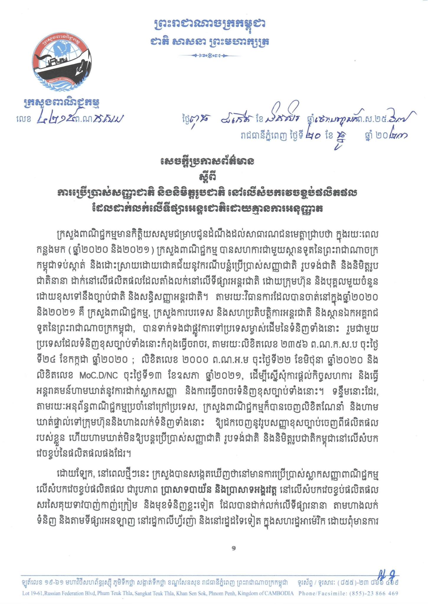 ក្រសួងពាណិជ្ជកម្ម បានអះអាងថា កន្លងមកក្រសួងបានសហការជាមួយស្ថានទូតកម្ពុជាប្រចាំនៅបណ្តាប្រទេស ដើម្បីទប់ស្កាត់ និងដោះស្រាយដោយជោគជ័យនូវករណីបន្លំប្រើប្រាស់ស្លាកសញ្ញាជាតិ រូបទង់ជាតិ និងនិមិត្តរូបជាតិននានា ដាក់នៅលើផលិតផលដែលតាំងលក់នៅទីផ្សារអន្តរជាតិដោយគ្មានច្បាប់អនុញ្ញាតត្រឹមត្រូវពីអាជ្ញាធរមានសមត្ថកិច្ចរបស់កម្ពុជា។
