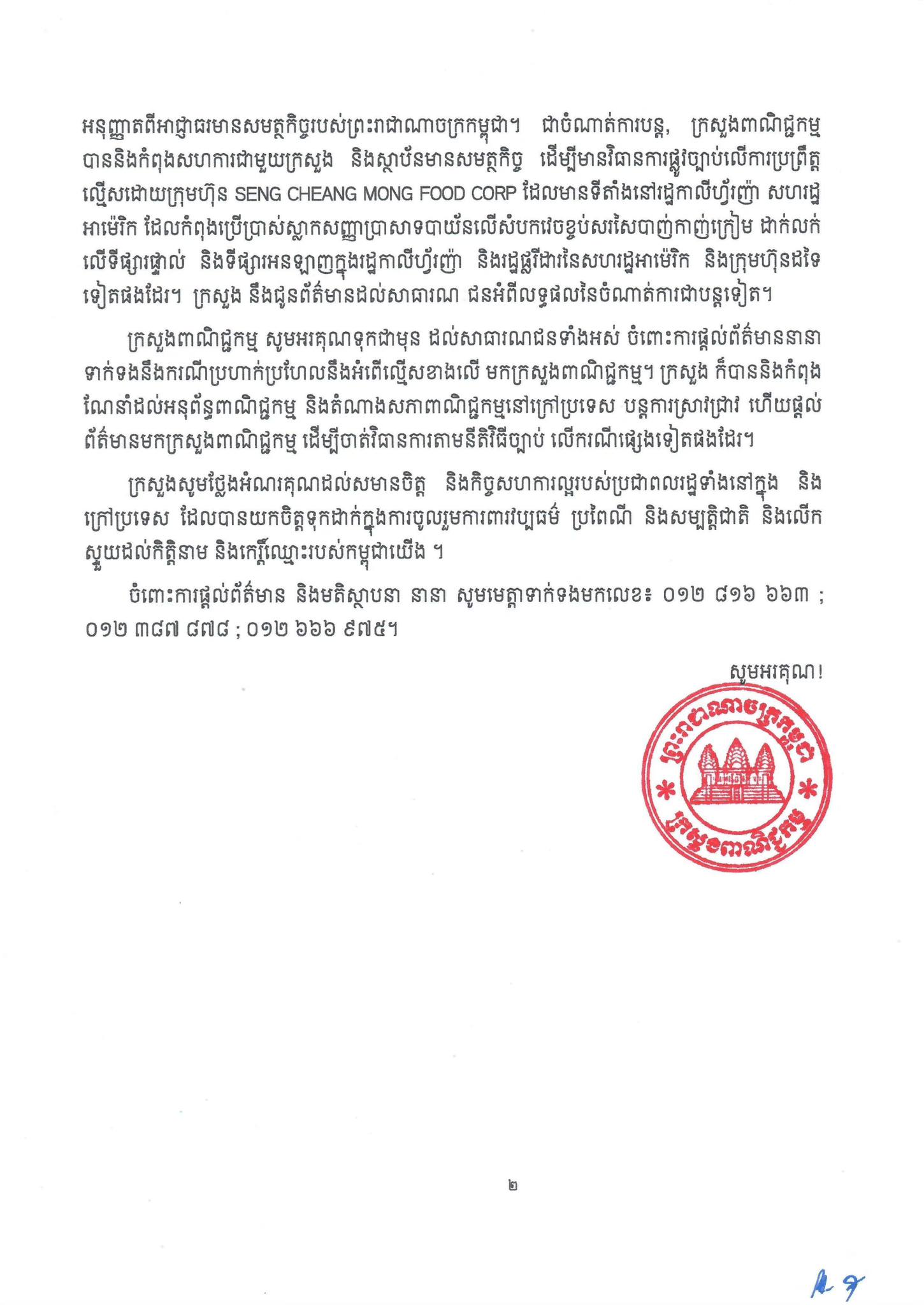 ក្រសួងអរគុណចំពោះសាធារណជនទាំងអស់ដែលបានផ្តល់ព័ត៌មាននានាទាក់ទងនឹងករណីការប្រើប្រាស់ស្លាកសញ្ញាអត្តសញ្ញាណជាតិ ហើយសាធារណជនអាចទាក់ទងមកលេខ ០១២ ៨១៦ ៦៦៣, ០១២ ៣៨៧ ៨៧៨ និងលេខទូរសព្ទ ០១២ ៦៦៦ ៩៧៥៕