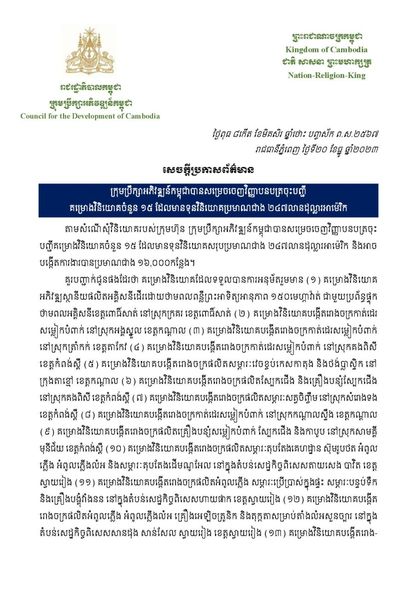 ភ្នំពេញ៖ រយៈពេល២សប្តាហ៍នៃខែធ្នូ ឆ្នាំ២០២៣ ក្រុមប្រឹក្សាអភិវឌ្ឍន៍កម្ពុជា (CDC) បានចុះបញ្ជីគម្រោងវិនិយោគចំនួន១៥ ដែលមានទុនវិនិយោគសរុបប្រមាណជាង ២៤៧ លានដុល្លារ និងអាចបង្កើតការងារបានប្រមាណជាង ១៦,០០០កន្លែង។ នេះបើតាមសេចក្ដីជូនដំណឹង។