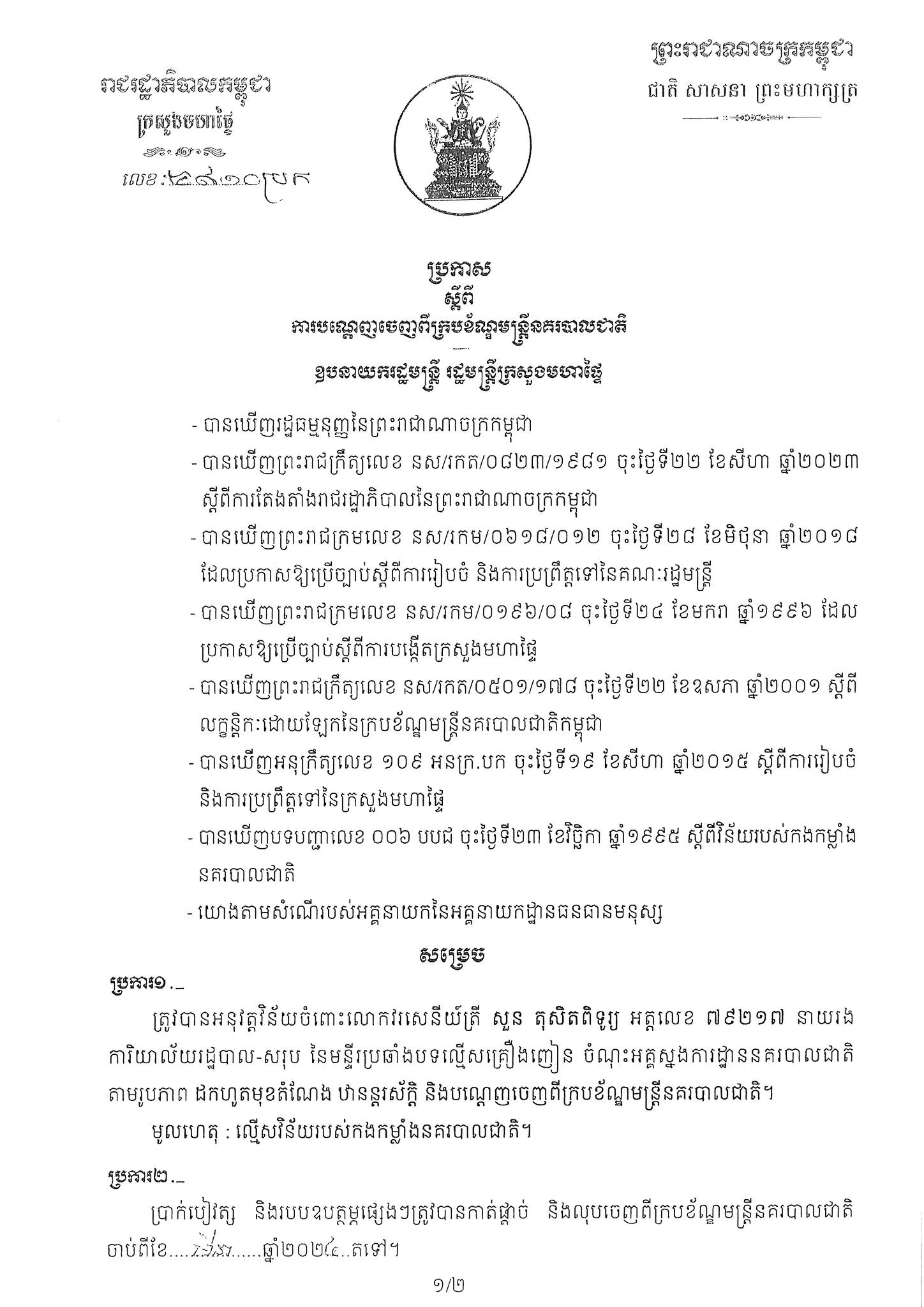 ភ្នំពេញ៖ លោកវរសេនីយ៍ត្រី សួន តុសិត្យពិទូរ្យ ត្រូវបានក្រសួងមហាផ្ទៃ ដកហូតមុខតំណែងឋានន្តរស័ក្ដិ និងបណ្ដេញចេញពីក្របខ័ណ្ឌមន្ត្រីនគរបាលជាតិ។ នេះបើតាមសេចក្តីប្រកាសចុះនៅថ្ងៃទី១៩ ខែធ្នូ ឆ្នាំ២០២៣។