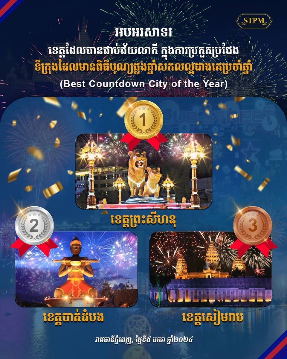 (ភ្នំពេញ) ៖ សម្តេចមហាបវរធិបតី ហ៊ុន ម៉ាណែត នាយករដ្ឋមន្ត្រីនៃព្រះរាជាណាចក្រកម្ពុជា តាមរយៈបណ្តាញសង្គម បានបង្ហោះសារអបអរសាទរ ខេត្តព្រះសីហនុ ខេត្តបាត់ដំបង និងខេត្តសៀមរាប ដែលបានជាប់ជ័យលាភី ក្នុងការប្រកួតប្រជែង «ទីក្រុងដែលមានពិធីបុណ្យឆ្លងឆ្នាំសកលល្អជាងគេប្រចាំឆ្នាំ» (Best Countdown City of the Year)។