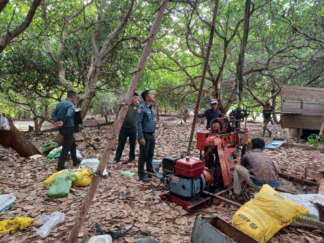 ក្នុងការបង្ក្រាបនេះ បានដកហូតវត្ថុតាងរួមមាន រថយន្ត ១ គ្រឿង ម៉ាក FORD RANGER ពណ៌ខ្មៅ ពាក់ផ្លាកលេខ ភ្នំពេញ 2BB-1383 ដែលជនសង្ស័យបើករត់គេចចេញពីកន្លែងកើតហេតុ និងវត្ថុតាងនៅកន្លែងកើតហេតុរួមមាន៖ ម៉ាស៊ីនខួងរ៉ែ ០២ គ្រឿង, ម៉ាស៊ីនគោយន្ត ០២ គ្រឿង, ទុយោជ័រ ០៤, ហ្វុយដាក់ទឹក ០៤ ,ដែកបំពង់ទីប ៤៦ ដើម, ដែកបំពុងទីបធ្វើជើងជ្រែងទប់ម៉ាស៊ីន ១២ កំណាត់ ។