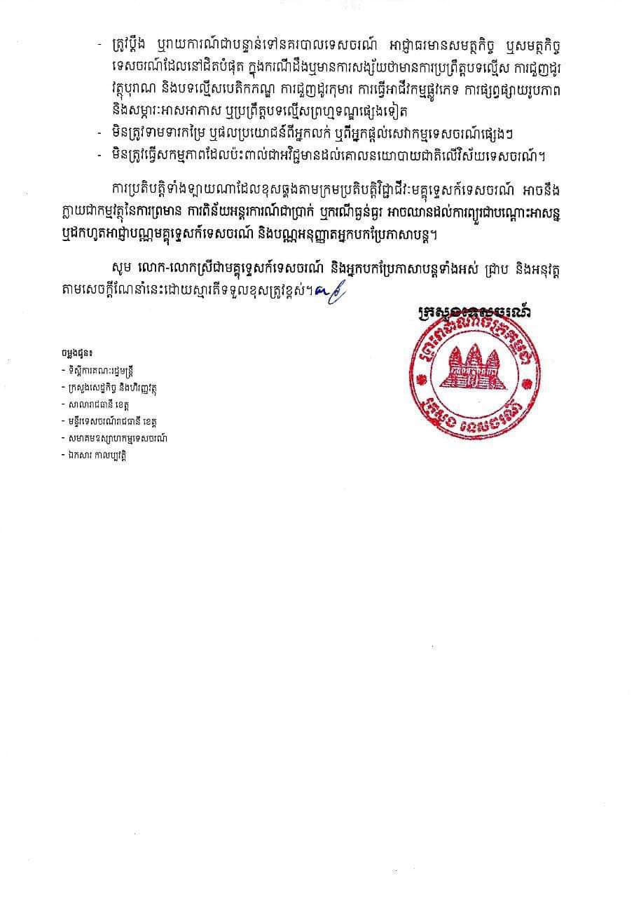 ក្រសួងទេសចរណ៍ណែនាំឱ្យមគ្គុទ្ទេសក៍ទេសចរណ៍ អនុវត្តឱ្យបានត្រឹមត្រូវនូវក្រមប្រតិបត្តិវិជ្ជាជីវៈ និងក្រមសីលធម៌វិជ្ជាជីវៈ