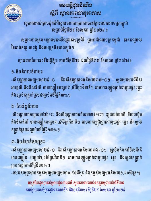 ក្រសួងបញ្ជាក់ថា សម្ពាធទាបគ្របដណ្ដប់មកលើឈូងសមុទ្រថៃ ព្រះរាជាណាចក្រកម្ពុជា ភាគកណ្តាលនៃអាងទន្លេ មេគង្គ និងសមុទ្រចិនខាងត្បូង។ ស្ថានភាពបែបនេះនឹងធ្វើឱ្យ៖ ចាប់ពីថ្ងៃទី២៥ ដល់ថ្ងៃទី២៧ ខែមេសា ឆ្នាំ២០២៤៖