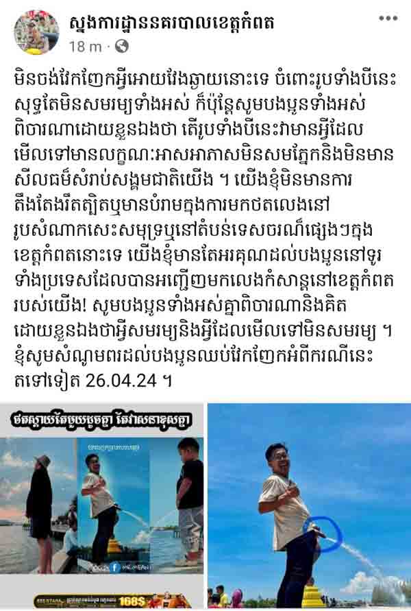 ស្នងការដ្ឋាន​ខេត្តកំពត​នៅ​ថ្ងៃទី​២៦ ខែមេសា ឆ្នាំ​២០២៤​នេះ បាន​បង្ហោះ​សារ​តាមរយៈ​ហ្វេ​ស​ប៊ុ​ក​ផ្លូវការ​ដែលមាន​ខ្លឹមសារ​ថា​៖ “ មិន​ចង់​វែកញែក​អ្វី​ឱ្យ​វែងឆ្ងាយ​នោះទេ ចំពោះ​រូប​ទាំងបី​នេះ​សុទ្ធតែ​មិន​សមរម្យ​ទាំងអស់ ក៏ប៉ុន្តែ​សូម​បងប្អូន​ទាំងអស់​ពិចារណា​ដោយ​ខ្លួនឯង​ថា តើ​រូប​ទាំងបី​នេះ​វា​មាន​អ្វីដែល​មើលទៅ​មាន​លក្ខណៈ​អាសអាភាស​មិន​សម​ភ្នែក ​និង​មិនមាន​សី​លធ​ម៌សម្រាប់​សង្គមជាតិ​យើង ។