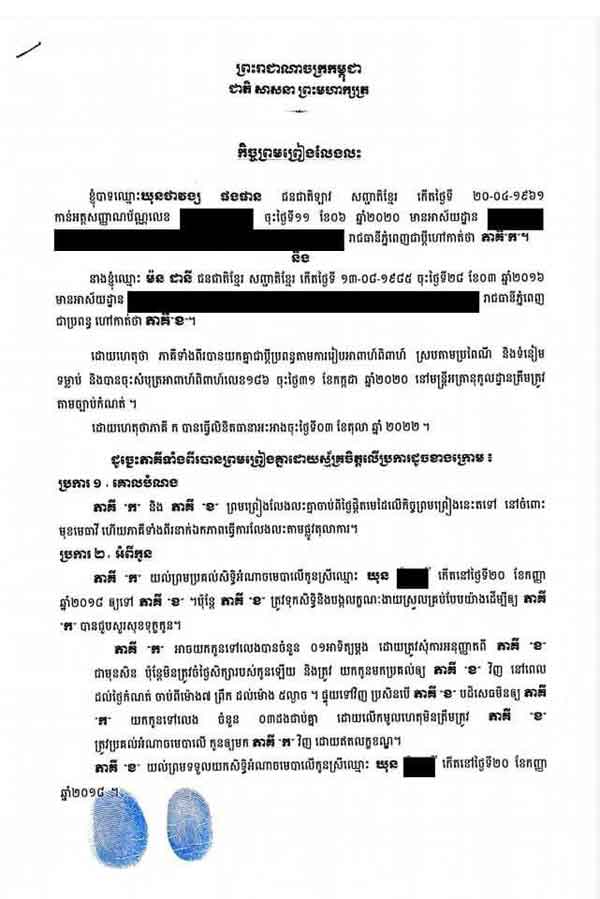 ខាងក្រោម​នេះ​ជា​ខ្លឹមសារ​ទាំងស្រុង​នៃ​កិច្ចព្រមព្រៀង​លែងលះ ដែល​លោក​ឃុន ថាវ​ង្ស ផង​ផាន បាន​បង្ហោះ​លើ​បណ្តាញ​ហ្វេ​ស​ប៊ុ​ក ៖