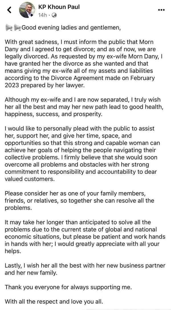 សាធារណជន​ភ្ញាក់ផ្អើល ខណៈដែល​ម្ចាស់​ក្រុមហ៊ុន​អចលនទ្រព្យ KP (​ម៉ន ដា​នី​)​ បង្ហោះ​សារ​លែងលះ​លើ​បណ្តាញ​ហ្វេ​ស​ប៊ុ​ក​