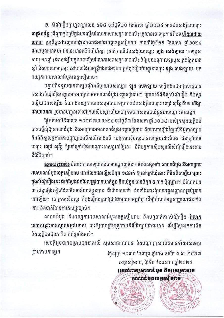 ខេត្តសៀមរាប៖ ចៅក្រមស៊ើបសួរនៃសាលាដំបូងខេត្តសៀមរាប បានសម្រេចឃុំខ្លួនជនសង្ស័យ ៥នាក់ និងម្នាក់ទៀត លើកលែងឱ្យនៅក្រៅឃុំ ក្នុងចំណោម ២០នាក់ បាននាំគ្នាបំពានបូកបានសម្រេច (រំលោភបូក) ទៅលើក្មេងស្រី អាយុ ១៥ ឆ្នាំម្នាក់ ត្រូវកម្លាំងការិយាល័យប្រឆាំងការជួញដូរមនុស្ស នៃកងរាជអាវុធហត្ថខេត្តសៀមរាប នាំខ្លួនទៅតុលាការខេត្ត ចាត់ការបន្តទៅតាមផ្លូវច្បាប់ កាលពីថ្ងៃទី១៩ ខែមេសា ឆ្នាំ២០២៤។ នេះបើយោងតាមសេចក្ដីថ្លែងការណ៍របស់សាលាដំបូងខេត្តសៀមរាប។