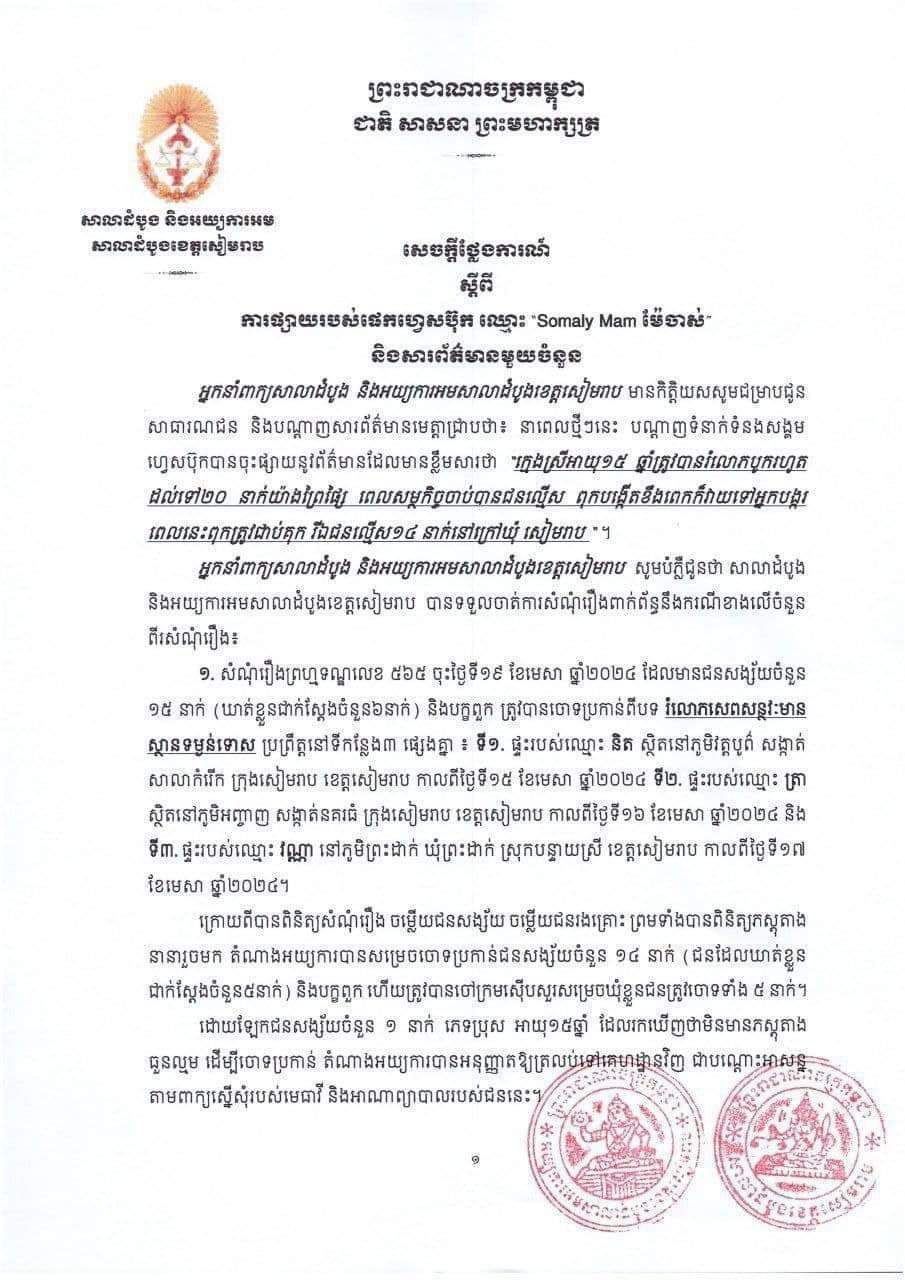 ហេតុការណ៍ឃាត់ខ្លួន ៦នាក់នោះ បានកើតឡើងនៅក្នុងថ្ងៃទី១៨ ខែមេសា ឆ្នាំ២០២៤ ស្ថិតនៅក្នុងក្រុងសៀមរាប។ អ្នកនាំពាក្យ សាលាដំបូង និងអយ្យការអមសាលាដំបូងខេត្តសៀមរាប នៅថ្ងៃទី០៣ ខែឧសភា ឆ្នាំ ២០២៤នេះ បានបំភ្លឺករណីផេកហ្វេសប៊ុកឈ្មោះ «Somaly Mam ម៉ែ ចាស់» និង សារព័ត៌មានមួយចំនួន បានចុះផ្សាយនូវព័ត៌មាន «ក្មេងស្រី អាយុ ១៥ឆ្នាំ ត្រូវបានរំលោភបូករហូតដល់ទៅ ២០ នាក់ ។ ពេលនេះសមត្ថកិច្ចចាប់បានជនល្មើស ខណៈពេលនោះឪពុក បង្កើតរបស់ក្មេងស្រីរងគ្រោះខឹងពេកក៏វាយទៅ ជនបង្ក ហើយឪពុករបស់ក្មេងស្រីរងគ្រោះ ត្រូវជាប់ពន្ធនាគារ រីឯជនល្មើស ១៤នាក់ នៅក្រៅឃុំ»។