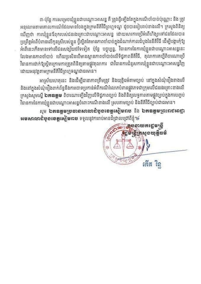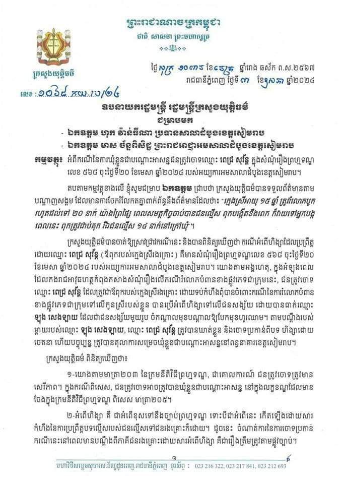 នៅថ្ងៃនេះដែរ បន្ទាប់ពីក្រសួងយុត្តិធម៌បានស្នើសុំឱ្យប្រធានសាលាដំបូង និងអយ្យការអមសាលាដំបូងខេត្តសៀមរាប ពិចារណា ឡើងវិញ លើទិដ្ឋភាពច្បាប់ និងពិនិត្យលទ្ធភាពតាមផ្លូវច្បាប់ លើករណីបំពានផ្លូវភេទ ជាក្រុមលើក្មេងស្រីម្នាក់ ចៅក្រមស៊ើបសួរ បានសម្រេចដោះលែងជនត្រូវចោទ ឈ្មោះ ពេជ្រ សុវ័ន្ត ឱ្យនៅក្រៅឃុំជាបណ្ដោះអាសន្ន នៅថ្ងៃទី០៣ ខែឧសភា ឆ្នាំ២០២៤នេះ និង បន្តការស៊ើបសួរលើសំណុំរឿងនេះ តាមនីតិវិធីច្បាប់ ។