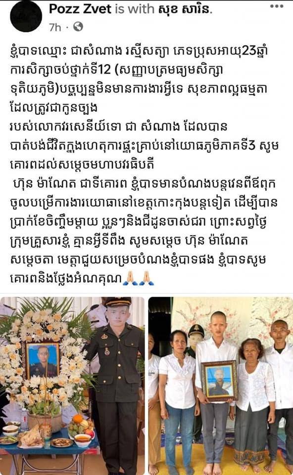 សម្តេចធិបតី សម្រេចផ្តល់ក្របខ័ណ្ឌជូនដល់សាច់ញាតិបង្កើត របស់យោធិនពលីទាំង ២០នាក់ ក្នុងឧបទ្ទវហេតុ នៅខេត្តកំពង់ស្ពឺ