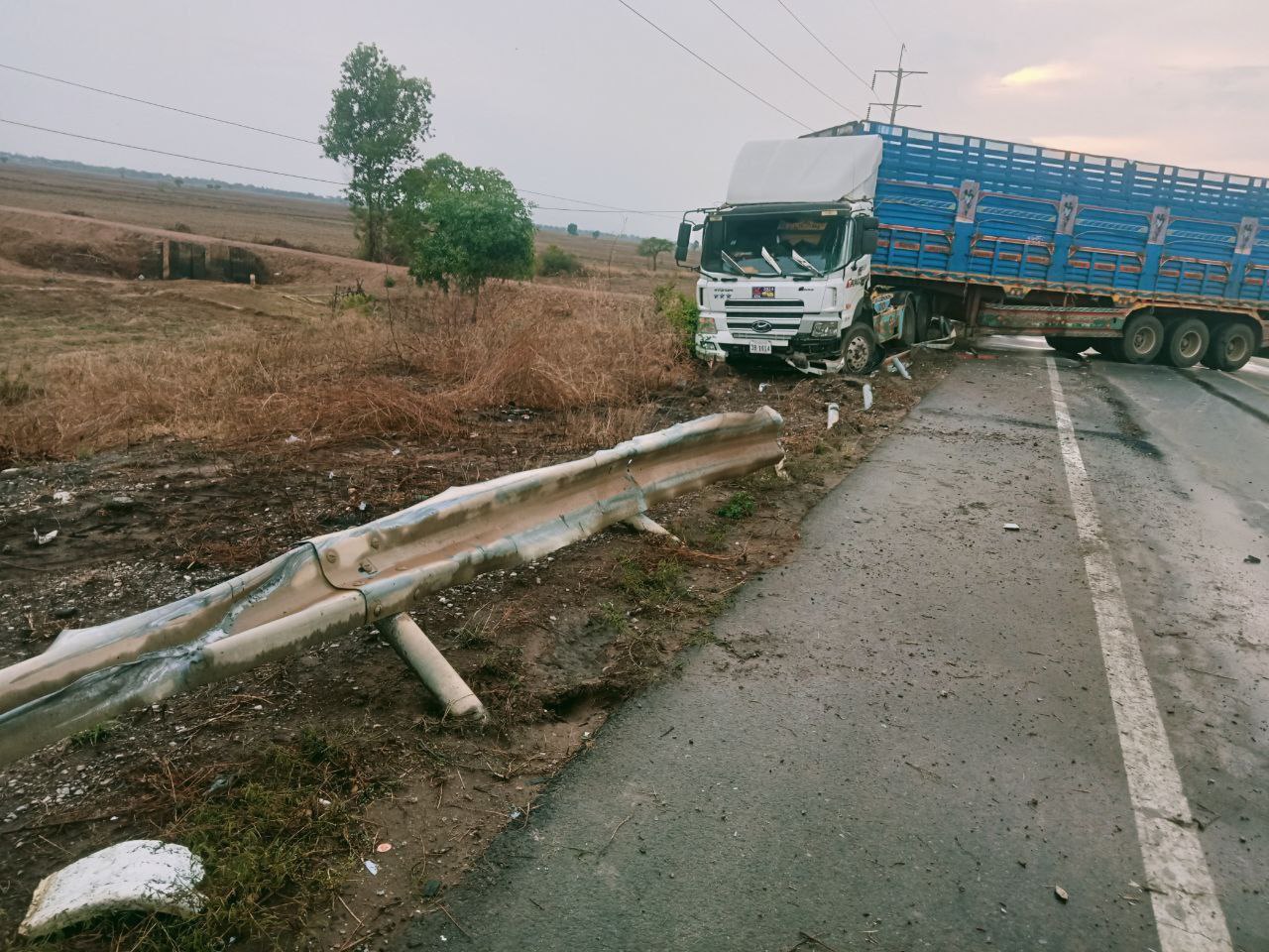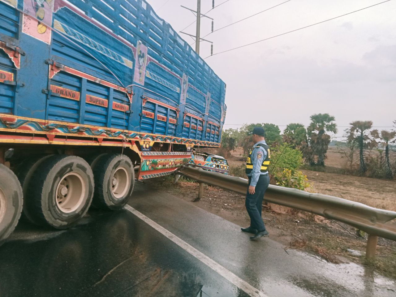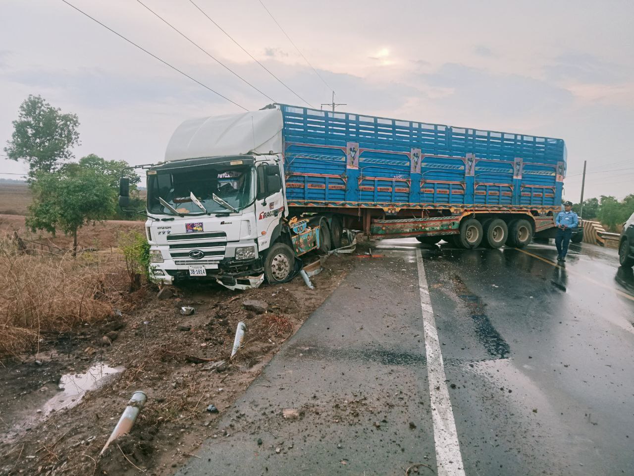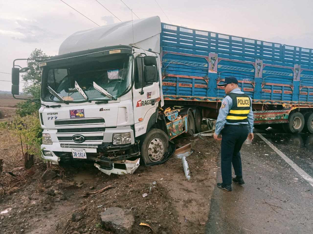 ខេត្តសៀមរាប៖ ករណីគ្រោះថ្នាក់ចរាចរណ៍ រវាងរថយន្តក្បាលអូសសណ្តោងរឺម៉កបុកគ្នាជាមួយរថយន្តលុច្សស៊ីស បណ្តាលឲ្យរងការខូចខាតរថយន្តទាំងសងខាងយ៉ាងដំណំ ចំណែកមនុស្សពុំមានរងរបួសឡើយ ហេតុការណ៍បានកើតឡើងនៅវេលាម៉ោង ១៦ និង៣៦នាទីរសៀល នៅថ្ងៃទី ១២ខែឧសភា ឆ្នាំ២០២៤ នៅចំណុចចន្លោះគីឡូម៉ែត្រលេខ ៣៥៣ និង៣៥៤ (លើស្ពានព្រីង) លើផ្លូវជាតិលេខ 6 ស្ថិតនៅភូមិគោកចាស់ ឃុំស្រណាល ស្រុកក្រឡាញ់ ខេត្តសៀមរាប។