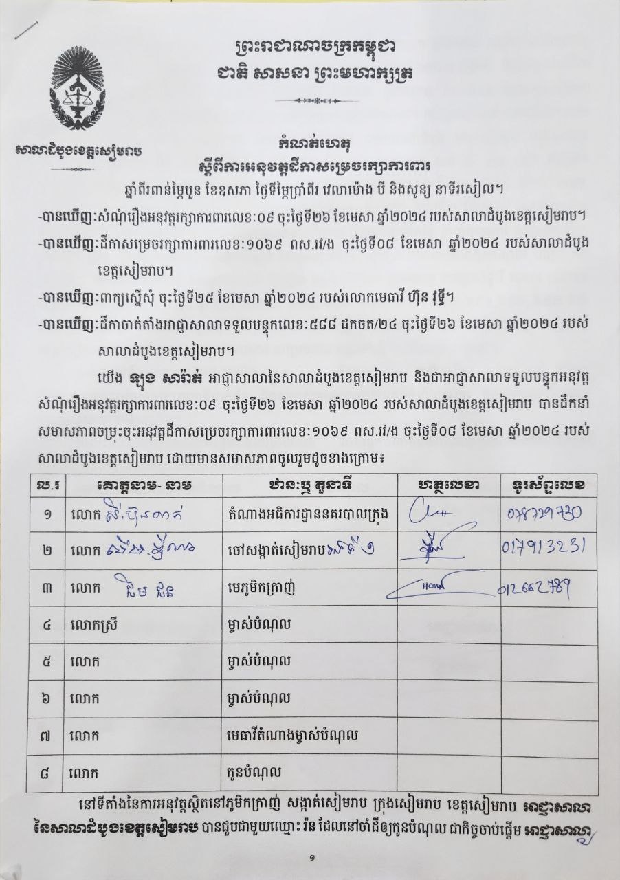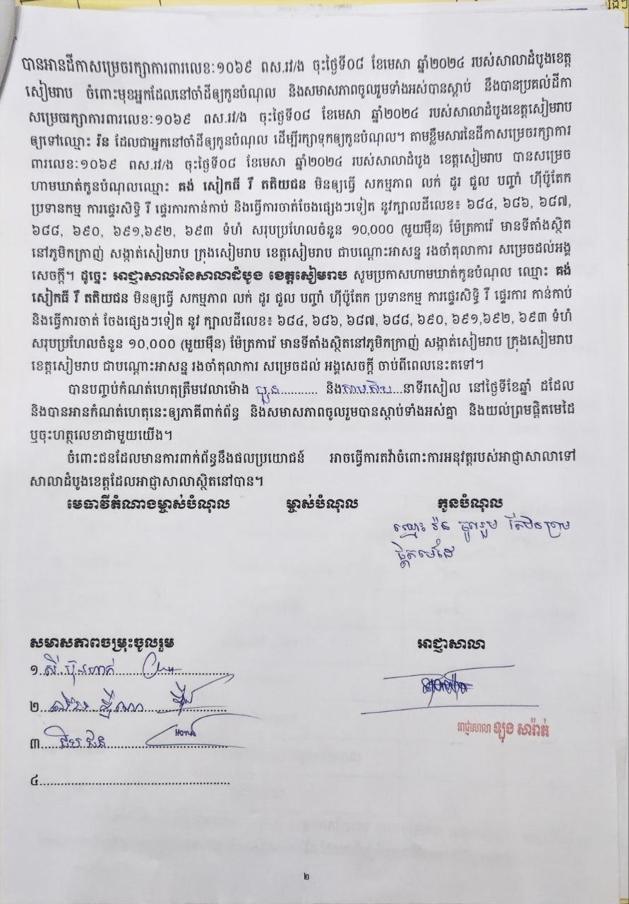 តុលាការខេត្តសៀមរាប ចុះអនុវត្តដីការរក្សាការពារដីទំហំ១ហិកតា ពីបុគ្គលជាអ្នកលក់ដីម្នាក់ ដែលមិនធ្វើតាមកិច្ចសន្យាចូលវិនិយោគ