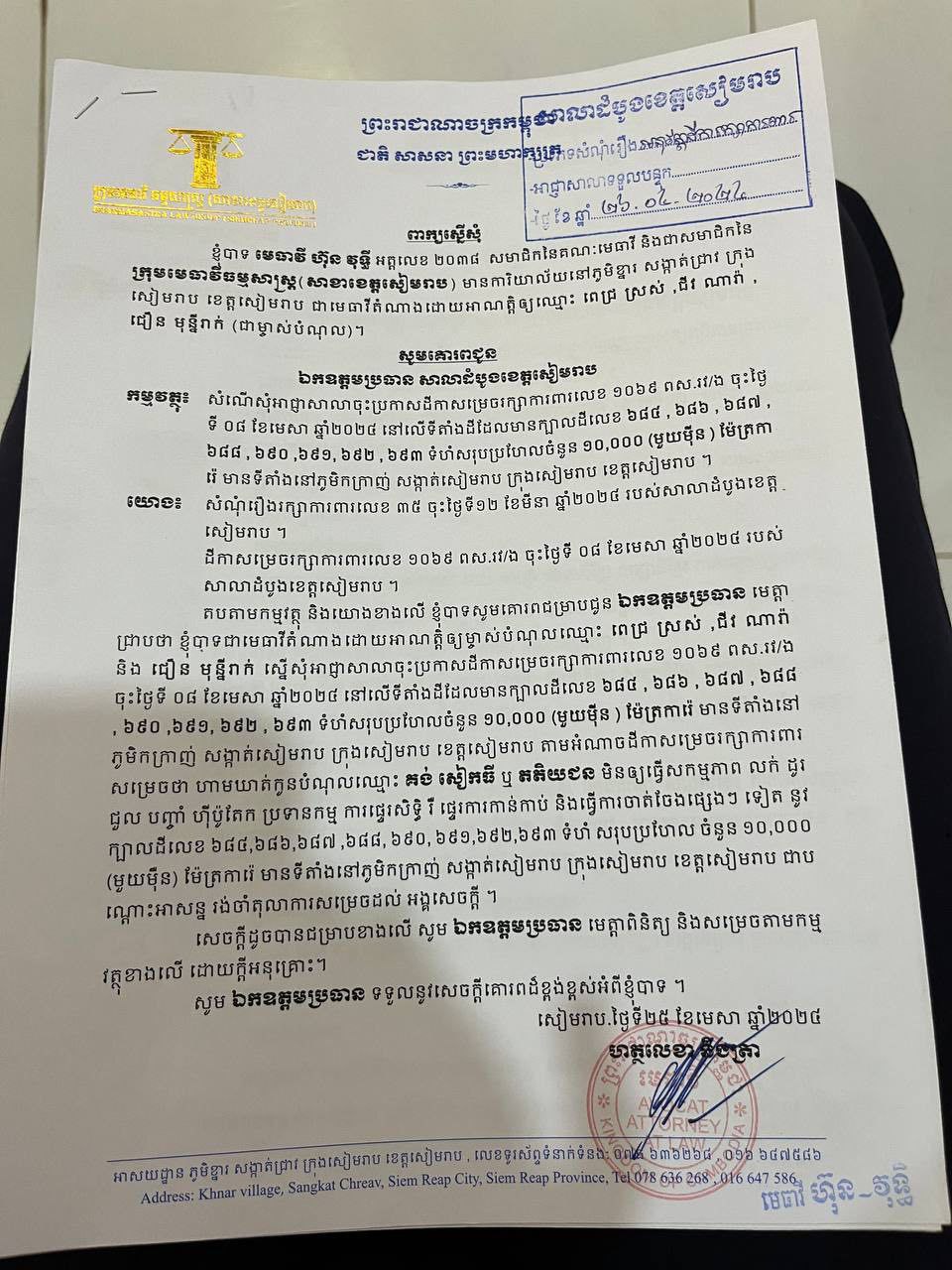 សូមបញ្ជាក់ថា ការឈានដល់តុលាការខេត្តសៀមរាបចេញដីកាចុះរក្សាការពារទីតាំងដីប្រមាណ១ហិកតាស្ថិតខាងលើនេះ ដើម្បីហាមឃាត់កូនបំណុលឈ្មោះ គង់ សៀកធី មិនឱ្យធ្វើសកម្មភាពលក់ដូរ ជួល បញ្ចាំ ហ៊ីប៉ូតែក ប្រទានកម្ម ផ្ទេរកម្មសិទ្ធិ ឬផ្ទេរកាន់កាប់ និងចាត់ចែងផ្សេងៗទៀត ជាបណ្ដោះអាសន្ន រង់ចាំតុលាការសម្រេចដល់អង្គសេចក្ដីចប់ជាស្ថាពរ ដោយសារ។