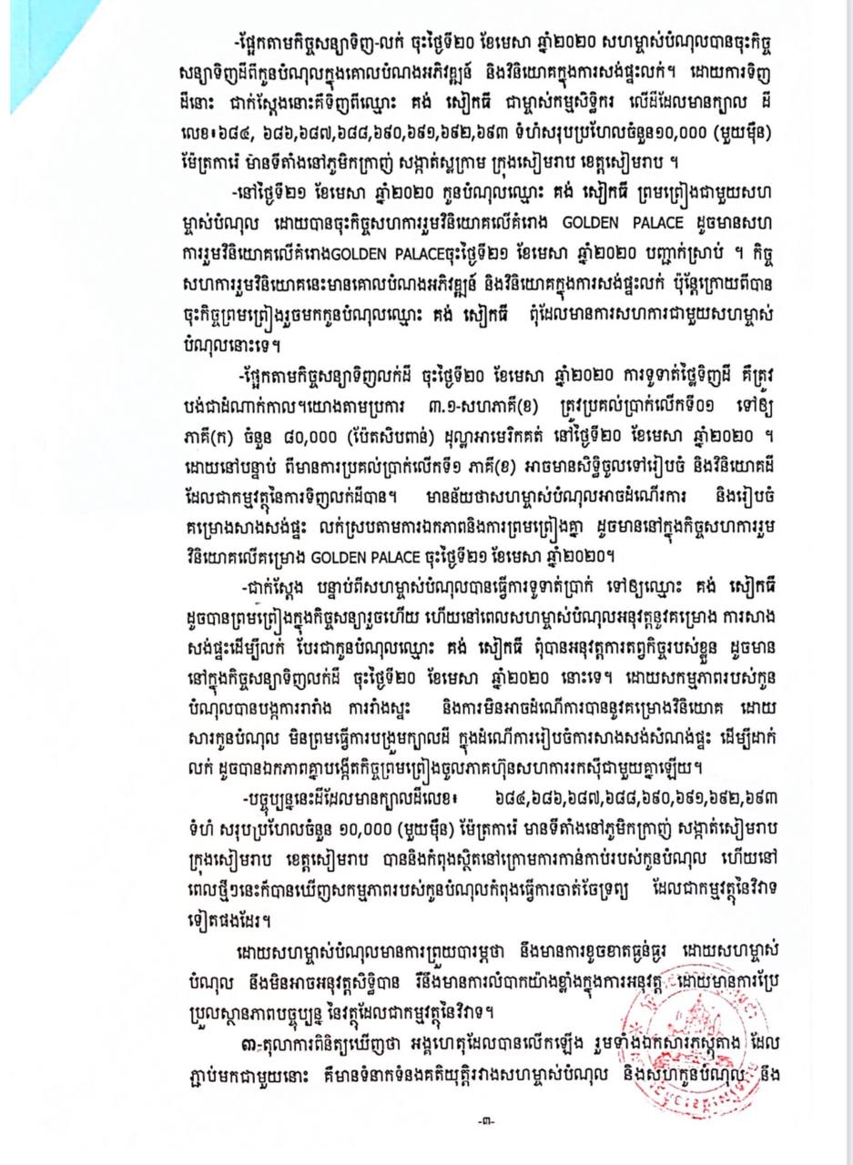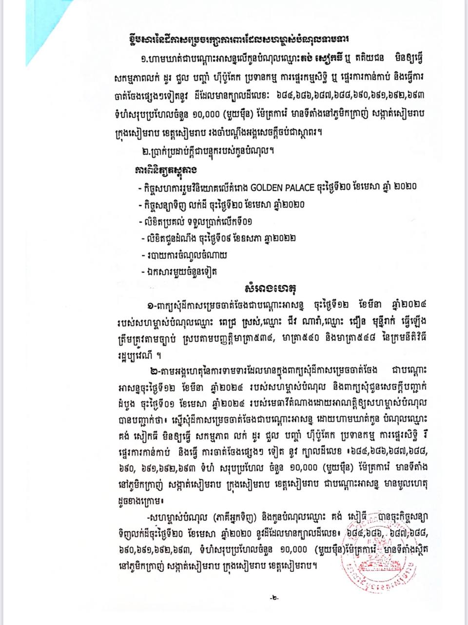 បើតាមខ្លឹមសារនៃដីការសម្រេចរក្សាការពាររបស់តុលាការខេត្តសៀមរាបបញ្ជាក់ថា ការចុះអនុវត្តដីការក្សាការពារទីតាំងដីនេះ ដោយសារកូនបំណុលដែលជាអ្នកលក់ដីទាំង១ហិកតា (ក្បាលដីលេខ ៦៨៤, ៦៨៧, ៦៨៨, ៦៩១, ៦៩២, ៦៩៣)ទៅឱ្យសហម្ចាស់បំណុលទាំងបីនាក់ខាងលើ ដោយសហម្ចាស់បំណុលទាំងបីទិញដីក្នុងគោលបំណងអភិវឌ្ឍន៍ និងវិនិយោគក្នុងការសង់ផ្ទះលក់ រហូតកូនបំណុលដែលជាម្ចាស់ដី បានព្រមព្រៀងជាមួយសហម្ចាស់បំណុលទាំងបីនាក់ ចុះកិច្ចសហការរួមវិនិយោគលើគម្រោង GOLDEN PALACE កាលពីថ្ងៃទី២១ ខែមេសា ឆ្នាំ២០២០។ ផ្ទុយទៅវិញ ក្រោយចុះកិច្ចព្រមព្រៀង កូនបំណុលឈ្មោះ គង់ សៀកធី បែរជាមិនសហការជាមួយម្ចាស់បំណុលទាំងបីនាក់ឡើយ ទាំងដែលសហម្ចាស់បំណុលបានទូទាត់ប្រាក់ជូនកូនបំណុលមួយចំនួន ដែលជាម្ចាស់ដីរួចរាល់ហើយតាមកិច្ចទិញ-លក់ និងកិច្ចសន្យាចូលរួមវិនិយោគ៕