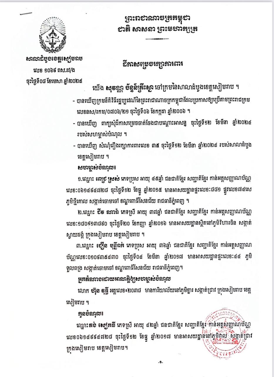 ទី២. ឈ្មោះ ជីវ ណារ៉ា អាយុ ៣៧ឆ្នាំ ជនជាតិខ្មែរ សញ្ជាតិខ្មែរ កាន់អត្តសញ្ញាណប័ណ្ណលេខ៖ ១៨០៩១៣៨៩០ ចុះថ្ងៃទី២០ ខែកញ្ញា ឆ្នាំ២០១៦ មានអាយដ្ឋានស្ថិតនៅភូមិវិហារចិន សង្កាត់ស្វាយដង្គំ ក្រុងសៀមរាប ខេត្តសៀមរាប។