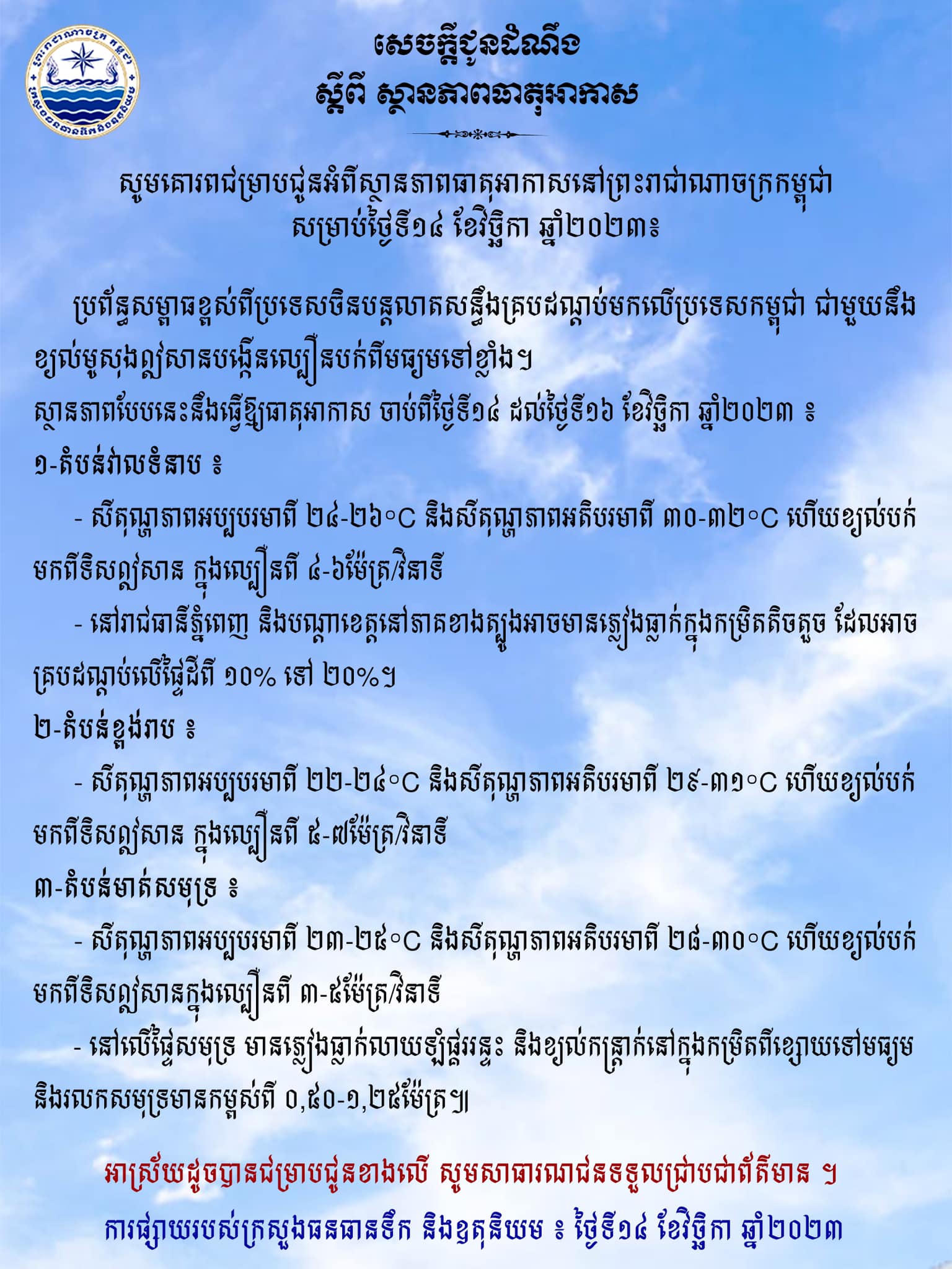 ក្រសួងធនធានទឹកជូនពីស្ថានភាពធាតុអាកាសនៅកម្ពុជាសម្រាប់ថ្ងៃទី១៤ ខែវិច្ឆិកា ឆ្នាំ២០២៣