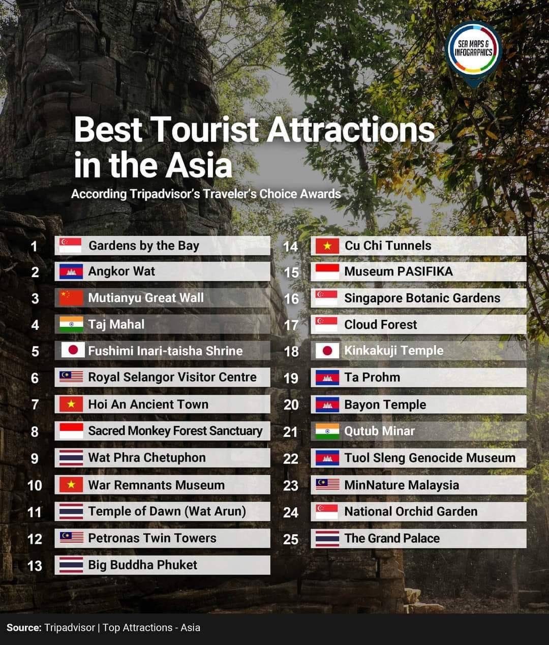 បើយោងតាមការចុះផ្សាយរបស់ក្រសួងទេសចរណ៍កម្ពុជា ប្រាសាទអង្គរវត្ត ដែលជាសម្បត្តិបេតិ​កភណ្ឌ​ដ៏មានតម្លៃរបស់កម្ពុជា កំពុងស្ថិតនៅលេខរៀងទី២ ប្រាសាទតាព្រហ្មកំពុងស្ថិតនៅ​លេខរៀង​ទី ១៩ ប្រាសាទបាយ័នស្ថិតនៅលំដាប់ទី ២០ និងសារមន្ទីរ ប្រល័យពូជសាសន៍ទួលស្លែង លំដាប់ទី ២២ ក្នុងចំណោមទាំង ២៥ គោលដៅទាក់​ទាញទេសចរណ៍​កំពូលនៅអាសុី។