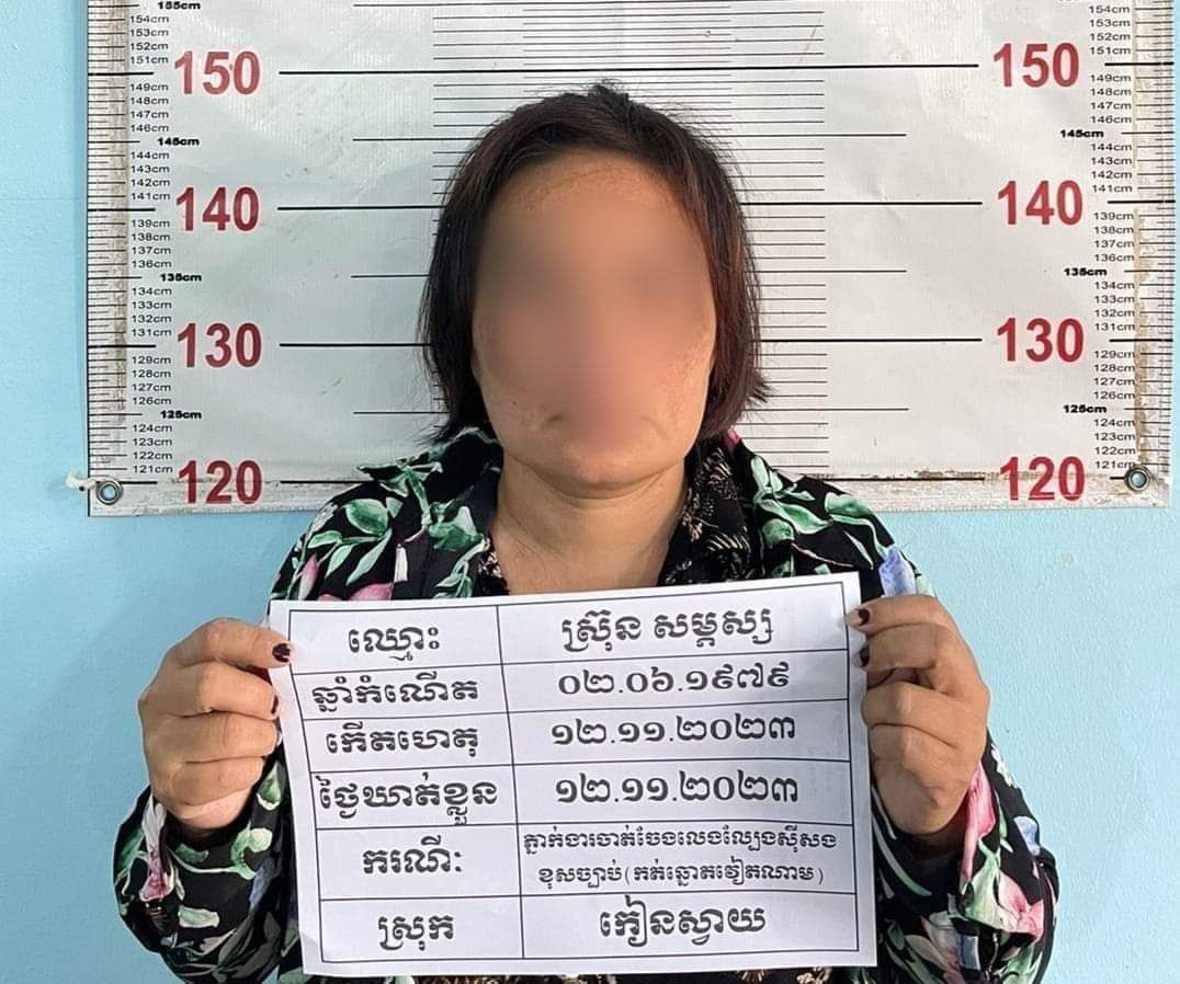 ខេត្តកណ្តាល៖ ថ្ងៃទី១២ ខែវិច្ឆិកាឆ្នាំ២០២៣ វេលាម៉ោង១៥:១៥នាទី នៅចំណុចកើតហេតុភូមិព្រែកប៉ុល ឃុំបន្ទាយដែក ស្រុកកៀនស្វាយខេត្តកកណ្ដាល ជនសង្ស័យ ចំនួន០១នាក់ឈ្មោះ ស្រ៊ុន សម្ពស្ស ភេទស្រីអាយុ៤៤ឆ្នាំ ជនជាតិខ្មែរមុខរបរកត់ឆ្នោតវៀតណាម មានទីលំនៅភូមិព្រែកប៉ុល ឃុំបន្ទាយដែក ស្រុកកៀនស្វាយ ខេត្តកណ្តាល (ឃាត់ខ្លួន)។