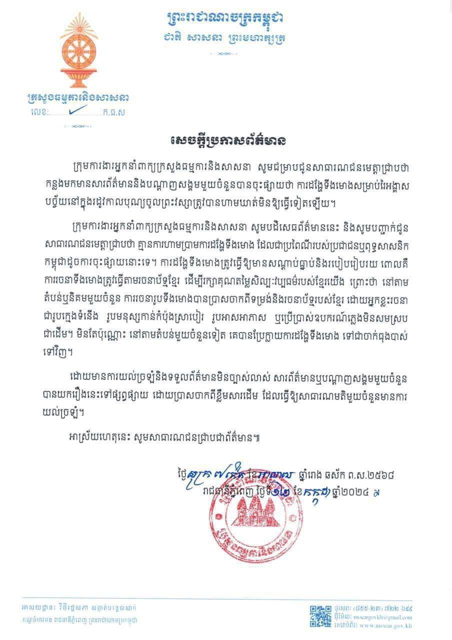 ក្រុមការងារអ្នកនាំពាក្យក្រសួងធម្មការនិងសាសនា សូមបដិសេធព័ត៌មាននេះ និងសូមបញ្ជាក់ជូន សាធារណជនមេត្តាជ្រាបថា គ្មានការហាមប្រាមការដង្ហែទីងមោង ដែលជាប្រពៃណីរបស់ប្រជាជនឬពុទ្ធសាសនិក កម្ពុជាដូចការចុះផ្សាយនោះទេ។ ការដង្ហែទីងមោងត្រូវធ្វើឱ្យមានសណ្តាប់ធ្នាប់និងរបៀបរៀបរយ ពោលគឺ ការរចនាទីងមោងត្រូវធ្វើតាមរចនាប័ទ្ឋខ្មែរ ដើម្បីរក្សាគុណតម្លៃសិល្បៈវប្បធម៌របស់ខ្មែរយើង ព្រោះថា នៅតាម តំបន់ឬនិគមមួយចំនួន ការរចនារូបទីងមោងបានប្រាសចាកពីទម្រង់និងរចនាប័ទ្ធរបស់ខ្មែរ ដោយអ្នកខ្លះរចនា ជារូបក្មេងទំនើង រូបមនុស្សកាន់កំប៉ុងស្រាបៀរ រូបអាសអាភាស ឬប្រើប្រាស់ឧបករណ៍ភ្លេងមិនសមស្រប ជាដើម។ មិនតែប៉ុណ្ណោះ នៅតាមតំបន់មួយចំនួនទៀត គេបានប្រែក្លាយការដង្ហែទីងមោង ទៅជាចាក់ធុងបាស់ ទៅវិញ។