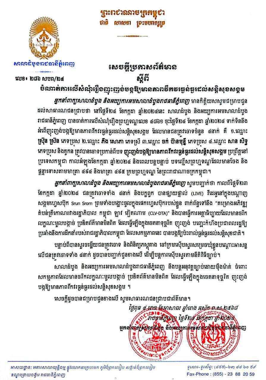 តាមសេចក្ដីប្រកាសព័ត៌មាន របស់សាលាដំបូងរាជធានីភ្នំពេញ បានឱ្យដឹងថានៅថ្ងៃទី២៤ ខែកក្កដា ឆ្នាំ២០២៤នេះ សាលាដំបូង និងអយ្យការអមសាលាដំបូង រាជធានីភ្នំពេញ បានចាត់ការលើសំណុំរឿងព្រហ្មទណ្ឌលេខ ៤៨៦១ ចុះថ្ងៃទី២៤ ខែកក្កដា ឆ្នាំ២០២៤ទាក់ទិននឹង អំពើញុះញង់បង្កឱ្យមានភាពវឹកវរធ្ងន់ធ្ងរ ដល់សន្តិសុខសង្គម ដែលមានជនត្រូវចោទចំនួន ៤នាក់ ១.ឈ្មោះ ស៊្រុន ស្រ៊ន ភេទប្រុស ២.ឈ្មោះ ភឹង សោភា ភេទស្រី ៣.ឈ្មោះ ចក់ ប៉ានមុន្នី ភេទប្រុស ៤.ឈ្មោះ សាន សិទ្ធ ភេទប្រុស និងគួកន ត្រូវបានចោទប្រកាន់ពីបទ ញុះញង់បង្កឱ្យមានភាពវឹកវរធ្ងន់ធ្ងរ ដល់សន្តិសុខសង្គម ប្រព្រឹត្តនៅ ប្រទេសកម្ពុជា កាលអំឡុងខែកក្កដា ឆ្នាំ២០២៤ និងពេលបន្តបន្ទាប់ បទល្មើសព្រហ្មទណ្ឌដែលមានចែង និង ផ្តន្ទាទោសតាមមាត្រា ៤៨៤ និងមាត្រា ៤៩៥ ក្រមព្រហ្មទណ្ឌ នៃព្រះរាជាណាចក្រកម្ពុជា។