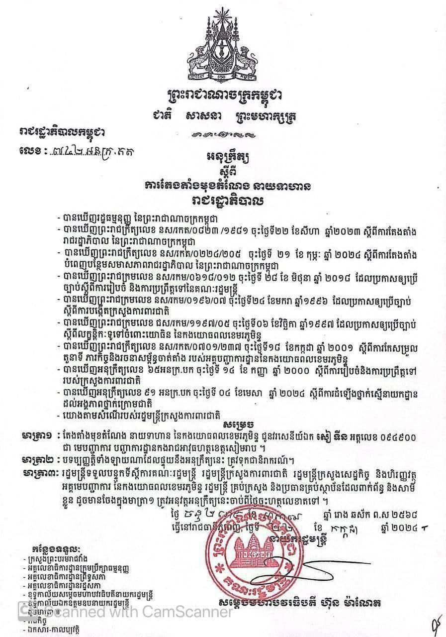 លោកវរសេនីយ៍ឯក សៀ ទីន ត្រូវបានតែងតាំងជាមេបញ្ជាការអាវុធហត្ថខេត្តសៀមរាប។ នេះបើតាមអនុក្រឹត្យរបស់សម្តេចមហាបវរធិបតី ហ៊ុន ម៉ាណែត នាយករដ្ឋមន្រ្តី នៃកម្ពុជា កាលពីថ្ងៃទី២២ ខែកក្កដា ឆ្នាំ២០២៤។