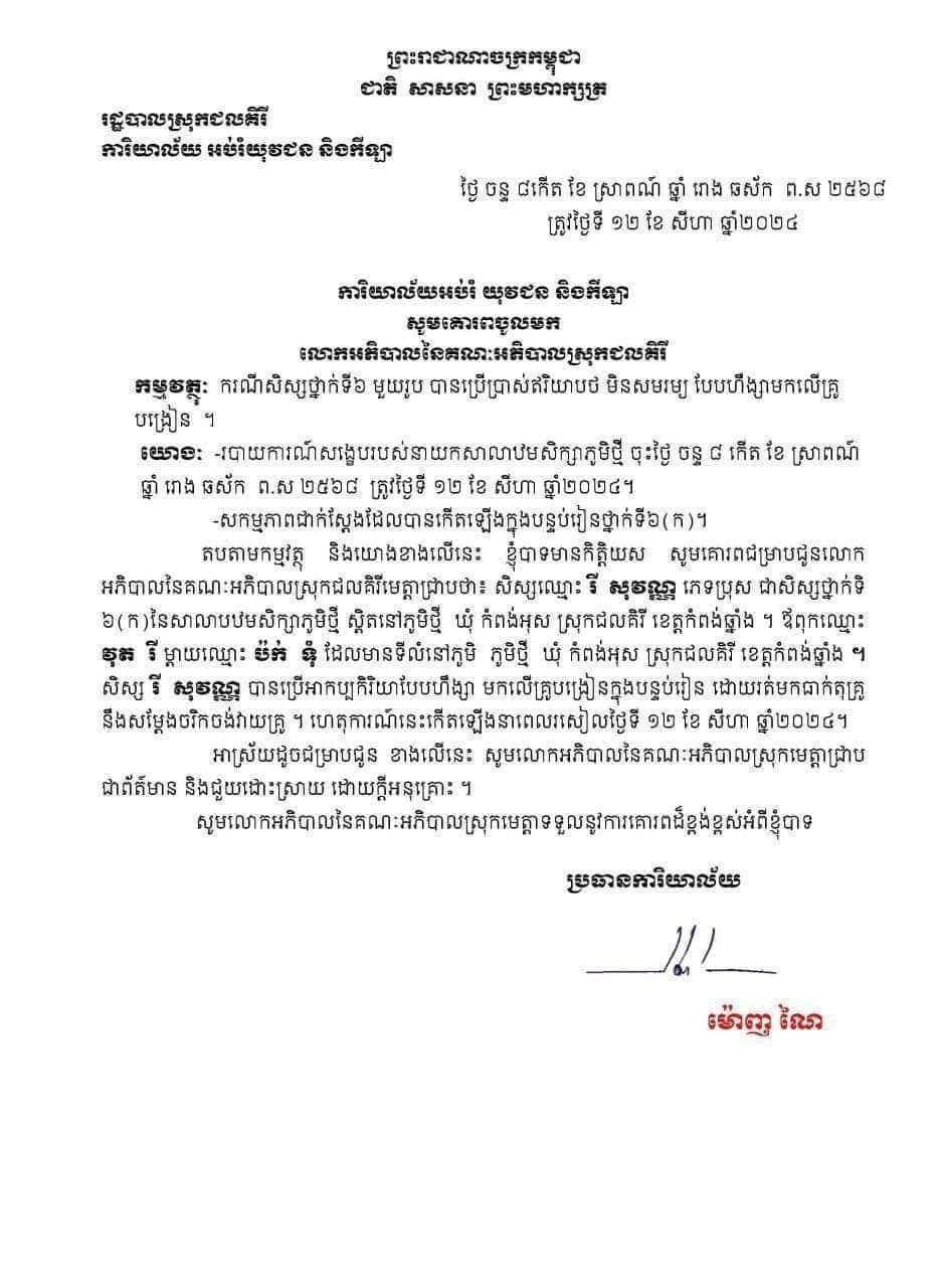 ខេត្តកំពង់ឆ្នាំង៖ សិស្សថ្នាក់ទី៦ម្នាក់ បានប្រើអាកប្បកិរិយាបែបហឹង្សា មកលើគ្រូបង្រៀនក្នុងបន្ទប់រៀន ដោយរត់មកធាក់តុគ្រូ នឹងសម្តែងចរិកចង់វាយគ្រូ ហេតុការណ៍នេះកើតឡើងនាពេលរសៀល ថ្ងៃទី១២ ខែសីហា ឆ្នាំ២០២៤ នៅសាលាបឋមសិក្សាភូមិថ្មី ស្ថិតនៅភូមិថ្មី ឃុំកំពង់អុស ស្រុកជលគិរី ខេត្តកំពង់ឆ្នាំង។