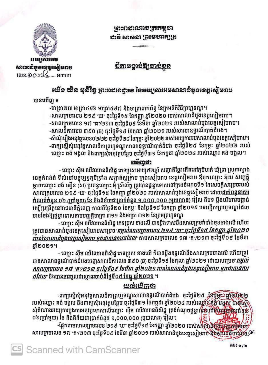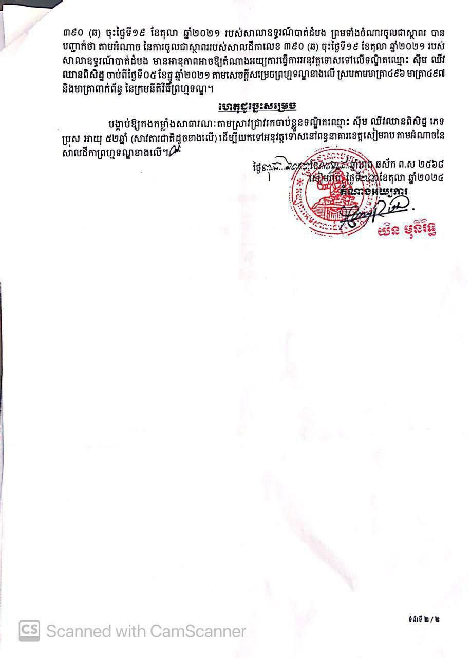 ការបង្គាប់ឲ្យចាប់ខ្លួន ឈ្មោះ ស៊ីម ឈីវឈានពិសិដ្ឋ ភេទប្រុស អាយុ ៥២ឆ្នាំ មុខរបរ មគ្គុទ្ទេស៍ទេសចរ និងជាចាងហ្វាង គេហទំព័រ អប់រំដើម្បីសេរីភាពនិងបរិស្ថាន ដែលមានទីលំនៅបច្ចុប្បន្ននៅភូមិទ្រាំង សង្កាត់ស្លក្រាម ក្រុងសៀមរាប ពាក់ព័ន្ធករណីបណ្តឹងបរិហារបង្កាច់កេរ្តិ៍ ប្រព្រឹត្តិនៅរាជធានីភ្នំពេញ កាលពីថ្ងៃទី២០ ខែកុម្ភះ និងថ្ងៃទី១៨ ខែកញ្ញា ឆ្នាំ២០១៩ បទល្មើសព្រហ្មទណ្ឌដែលមានចែងឳ្យផ្តន្ទាទោសតាមបញ្ញត្តិមាត្រា ៣១១ និងមាត្រា ៣១២ នៃក្រមព្រហ្មទណ្ឌ ។