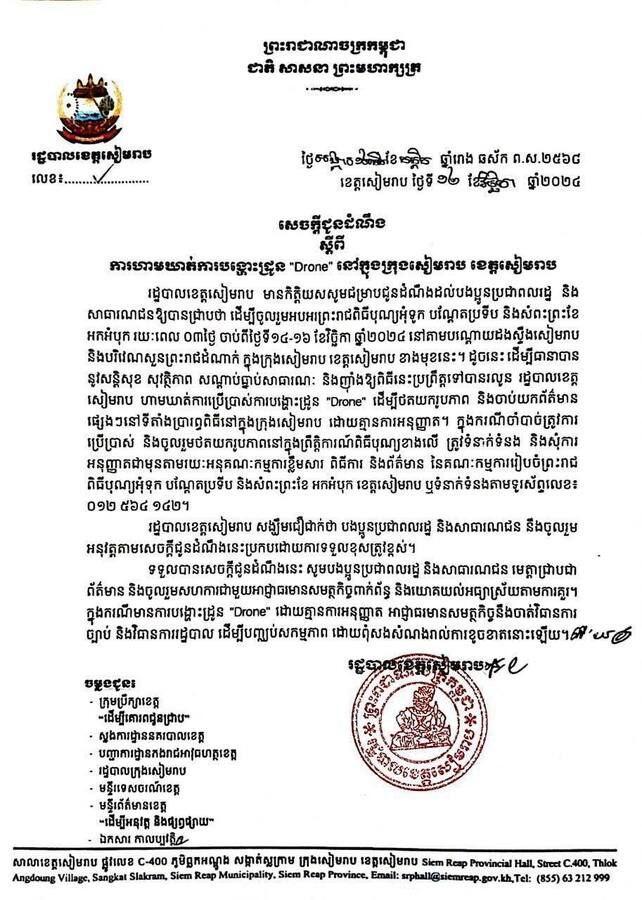 រដ្ឋបាលខេត្តសៀមរាប ហាមឃាត់ការប្រើប្រាស់ការបង្ហោះដ្រូន Drone ដើម្បីថតយករូបភាព និងចាប់យកព័ត៌មាន ផ្សេងៗនៅទីតាំងប្រារព្ធពិធីនៅក្នុងក្រុងសៀមរាប ដោយគ្មានការអនុញ្ញាត