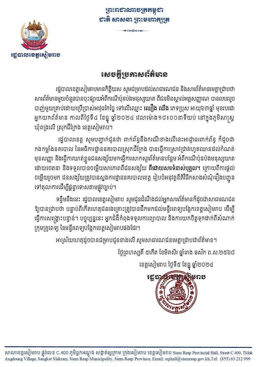 ខេត្តសៀមរាប៖ រដ្ឋបាលខេត្តសៀមរាបមានកិត្តិយស សូមជម្រាបដល់សាធារណជន និងសារព័ត៌មានមេត្តាជ្រាបថា សារព័ត៌មានមួយចំនួនបានចុះផ្សាយអំពីករណីប៉ុនប៉ងមនុស្សឃាត ពីជនមិនស្គាល់អត្តសញ្ញាណ បានលបលួច បាញ់មួយគ្រាប់ដោយប្រើប្រាស់អាវុធកែច្នៃ ទៅលើឈ្មោះ ឈឿង ឈឹង ភេទប្រុស អាយុ៦៣ឆ្នាំ មុខរបរជា អ្នកយកព័ត៌មាន កាលពីថ្ងៃទី៤ ខែធ្នូ ឆ្នាំ២០២៤ វេលាម៉ោង១៨៖០០នាទីយប់ នៅក្នុងភូមិសាស្ត្រ ឃុំពង្រលើ ស្រុកជីក្រែង ខេត្តសៀមរាប។