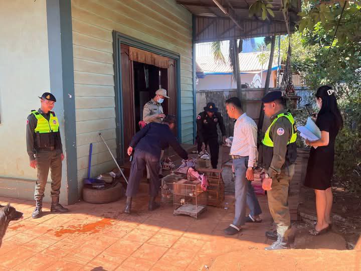 ខេត្តរតនគិរី៖ នាព្រឹកថ្ងៃទី៩ ខែមករា ឆ្នាំ២០២៥ កម្លាំងមូលដ្ឋានកងរាជអាវុធហត្ថក្រុងបានលុង ចំនួន ០៣នាក់ សហការជាមួយ កម្លាំងកងរាជអាវុធហត្ថលើផ្ទៃប្រទេសចំនួន ០៥ នាក់ ដឹកនាំដោយលោក ម៉ិញ មង្គល មន្ត្រីក្រុមអន្តរាគមន៍បង្ក្រាបបទល្មើសសត្វព្រៃចល័ត នៃរដ្ឋបាលព្រៃឈើ និងមានការសម្របសម្រួលពីលោក កែវ ភក្តី ព្រះរាជអាជ្ញារងអមសាលាដំបូងខេត្តរតនគិរី ចុះបង្ក្រាបករណី ធ្វើសន្និធិសត្វព្រៃដោយគ្មានលិខិតអនុញ្ញាត ស្ថិតក្នុងភូមិថ្មី សង្កាត់ឡាបានសៀក ក្រុងបានលុង ខេត្តរតនគិរី ជាលទ្ធផលបានឃាត់ខ្លួនមនុស្សចំនួន ០២ នាក់ និងចាប់យកវត្ថុតាងរួមមាន៖ ទី១. លលកបាយ (រស់) ចំនួន ០៦ ក្បាល, ទី២. ពពេចត្រចៀកក្រហម (រស់) ចំនួន ៥២ ក្បាល និងទី៣. ទ្រមាក់ខ្លា (រស់) ចំនួន ០១ក្បាល បច្ចុប្បន្នជនសង្ស័យ និងវត្ថុតាងត្រូវបានបញ្ជូនមកជំនាញខណ្ឌរដ្ឋបាលព្រៃរតនគិរី ដេីម្បីចាត់ការតាមនីតិវិធី។