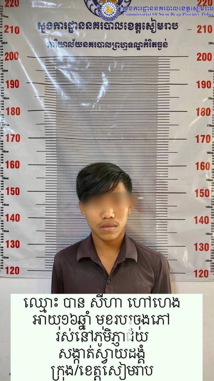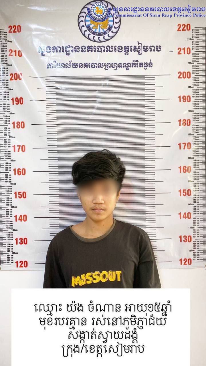 ៣.ឈ្មោះ យ៉ង ចំណាន អាយុ១៥ឆ្នាំ មុខរបរ គ្មាន មានស្រុកកំណើត និងទីលំនៅបច្ចុប្បន្នភូមិភ្ញាជ័យយ សង្កាត់ស្វាយដង្គំ ក្រុងសៀមរាប ខេត្តសៀមរាប (ជាម្ចាស់កាំបិតបុ័ងតោ) បានថតវីដេអូរបង្ហោះលើបណ្ដាញសង្គម នៅចំណុចផ្ទះរបស់ឈ្មោះ បាន សីហា នៅភូមិភ្ញាជ័យ សង្កាត់ស្វាយដង្គំ ក្រុងសៀមរាប ខេត្តសៀមរាប ។