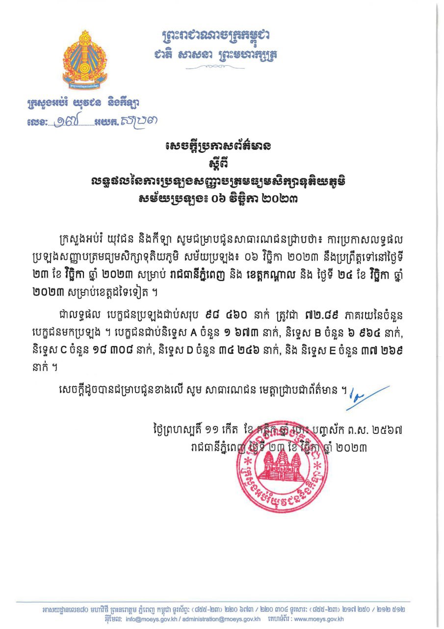 លទ្ធផលប្រឡងសញ្ញាបត្រមធ្យមសិក្សាទុតិយភូមិសម័យប្រឡងតាមនិទេ្ទសនីមួយៗ សម័យប្រឡង៖ ០៦ វិច្ឆិកា ២០២៣