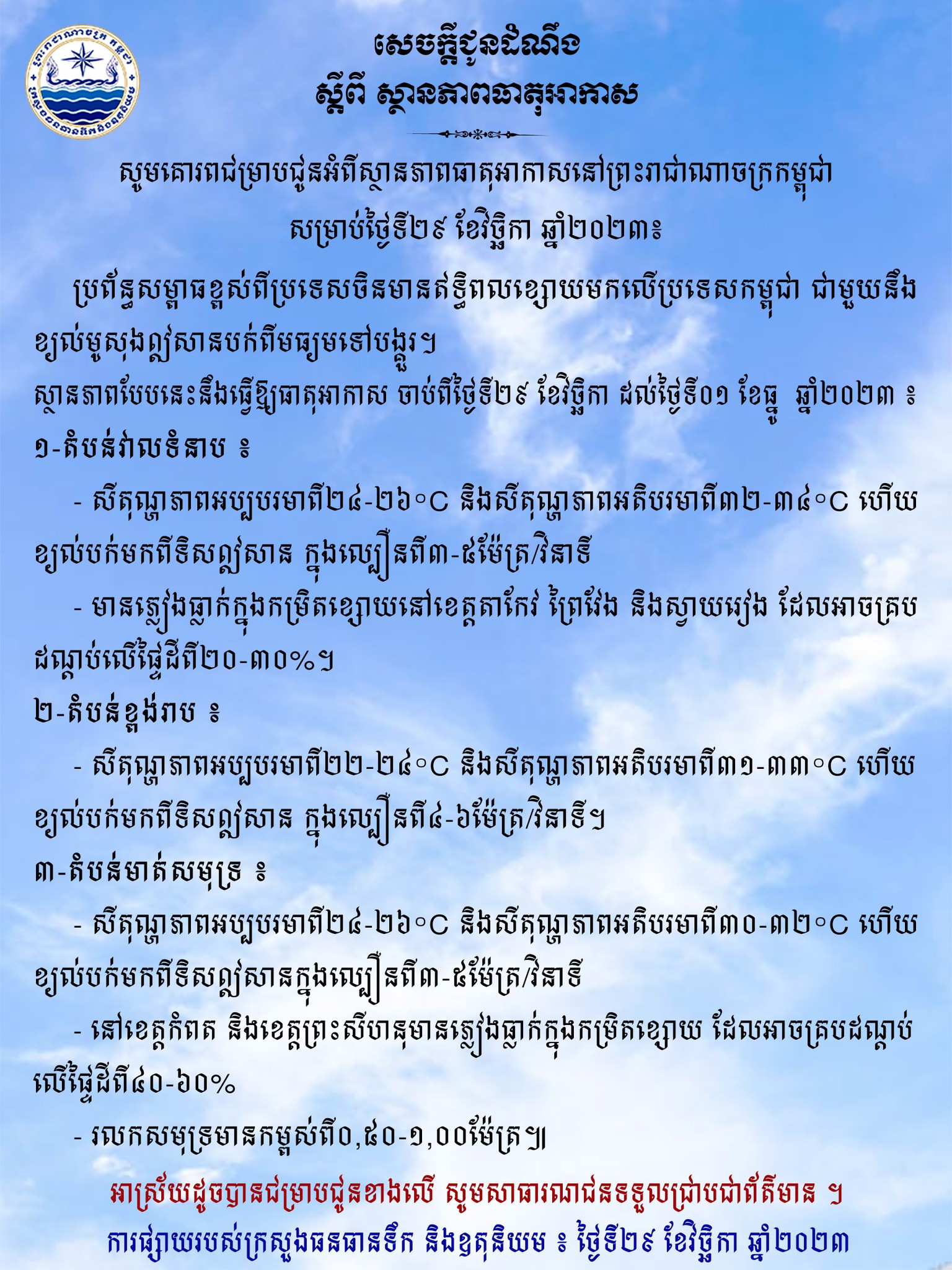 ក្រសួងធនធានទឹកជូនពីស្ថានភាពធាតុអាកាសនៅកម្ពុជាសម្រាប់ថ្ងៃទី២៩ ខែវិច្ឆិកា ឆ្នាំ២០២៣
