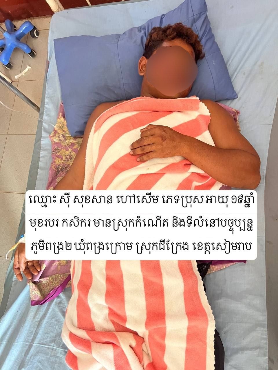 ៧-ឈ្មោះ ស៊ី សុសាន ហៅសើម ភេទប្រុស អាយុ ១៩ឆ្នាំ មុខរបរ កសិករ មានស្រុកកំណើត និងទីលំនៅបច្ចុប្បន្នភូមិពង្រ២ ឃុំពង្រក្រោម ស្រុកជីក្រែង ខេត្តសៀមរាប (ប្រវត្តិទោស គ្មាន) របួសធ្ងន់ កំពុងសម្រាកព្យាបាលនៅមន្ទីរពេទ្យ ។