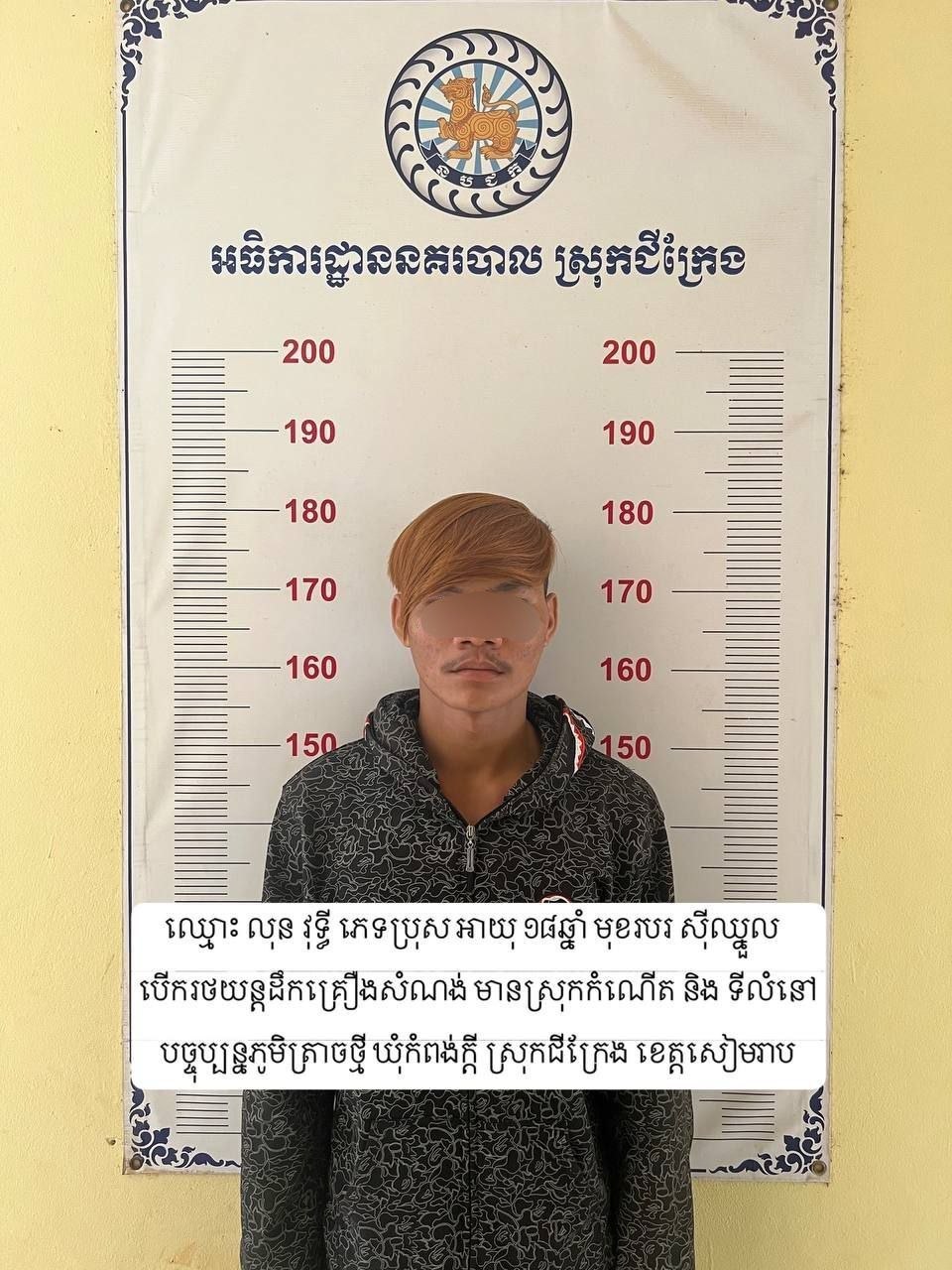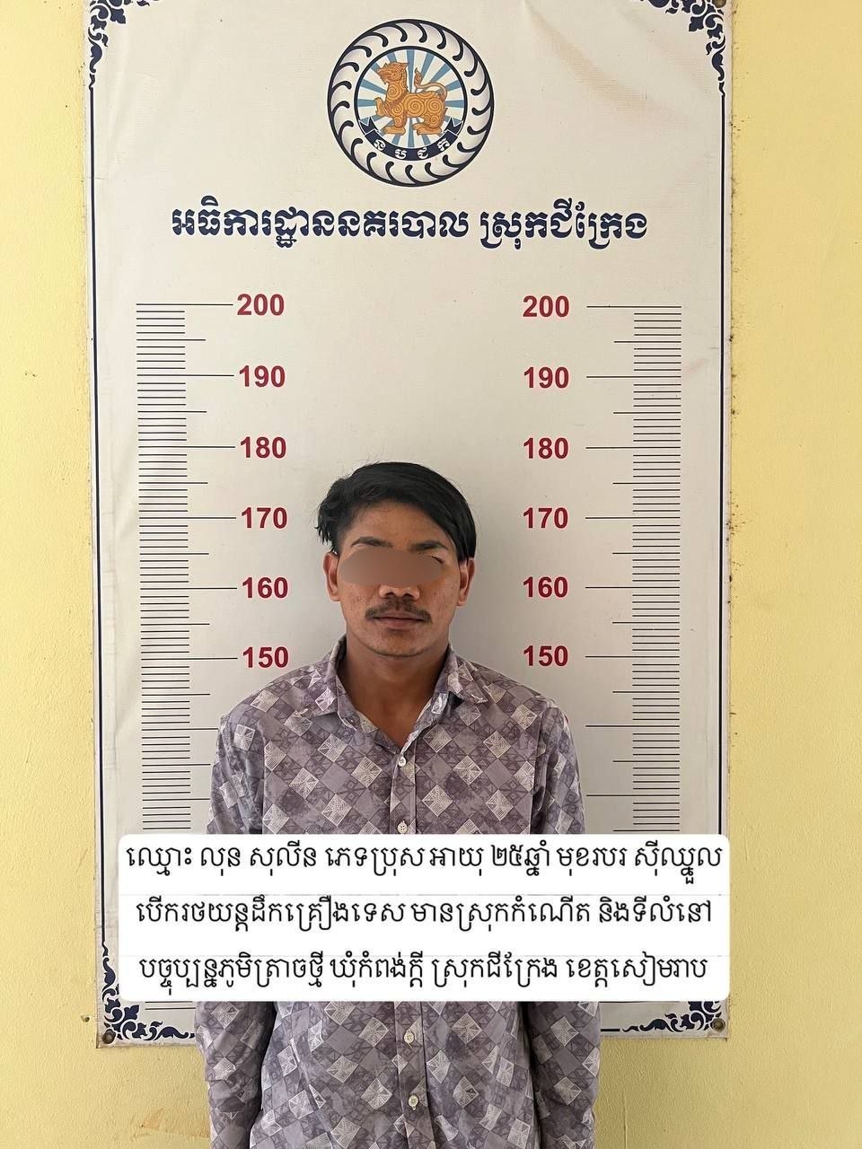១-ឈ្មោះ លុន សុលីន ភេទប្រុស អាយុ២៥ឆ្នាំ មុខរបរ ស៊ីឈ្នួលបើករថយន្តដឹកគ្រឿងទេស មានស្រុកកំណើត និងទីលំនៅបច្ចុប្បន្នភូមិត្រាចថ្មី ឃុំកំពង់ក្តី ស្រុកជីក្រែង ខេត្តសៀមរាប (ប្រវត្តិទោស គ្មាន)