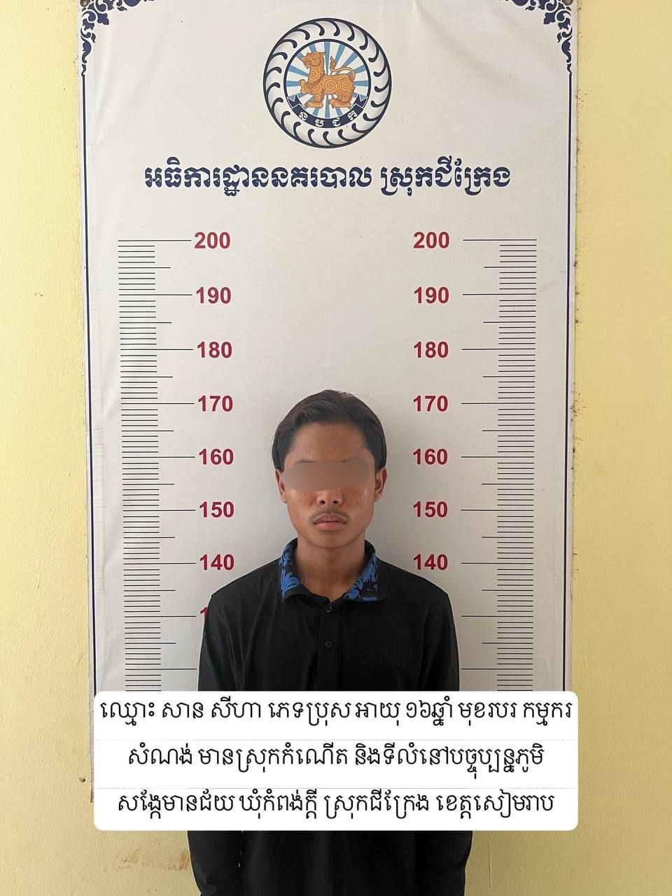 ៥-ឈ្មោះ សាន សីហា ភេទប្រុស អាយុ ១៦ឆ្នាំ មុខរបរ កម្មករសំណង់ មានស្រុកកំណើត និងទីលំនៅបច្ចុប្បន្នភូមិសង្កែមានជ័យ ឃុំកំពង់ក្តី ស្រុកជីក្រែង ខេត្តសៀមរាប (ប្រវត្តិទោស គ្មាន)
