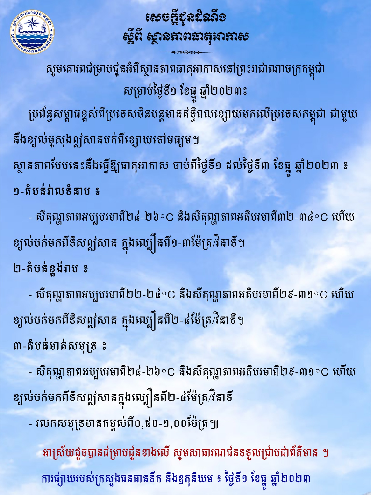 ក្រសួងធនធានទឹកជូនពីស្ថានភាពធាតុអាកាសនៅកម្ពុជាសម្រាប់ថ្ងៃទី១ ខែធ្នូ ឆ្នាំ២០២៣