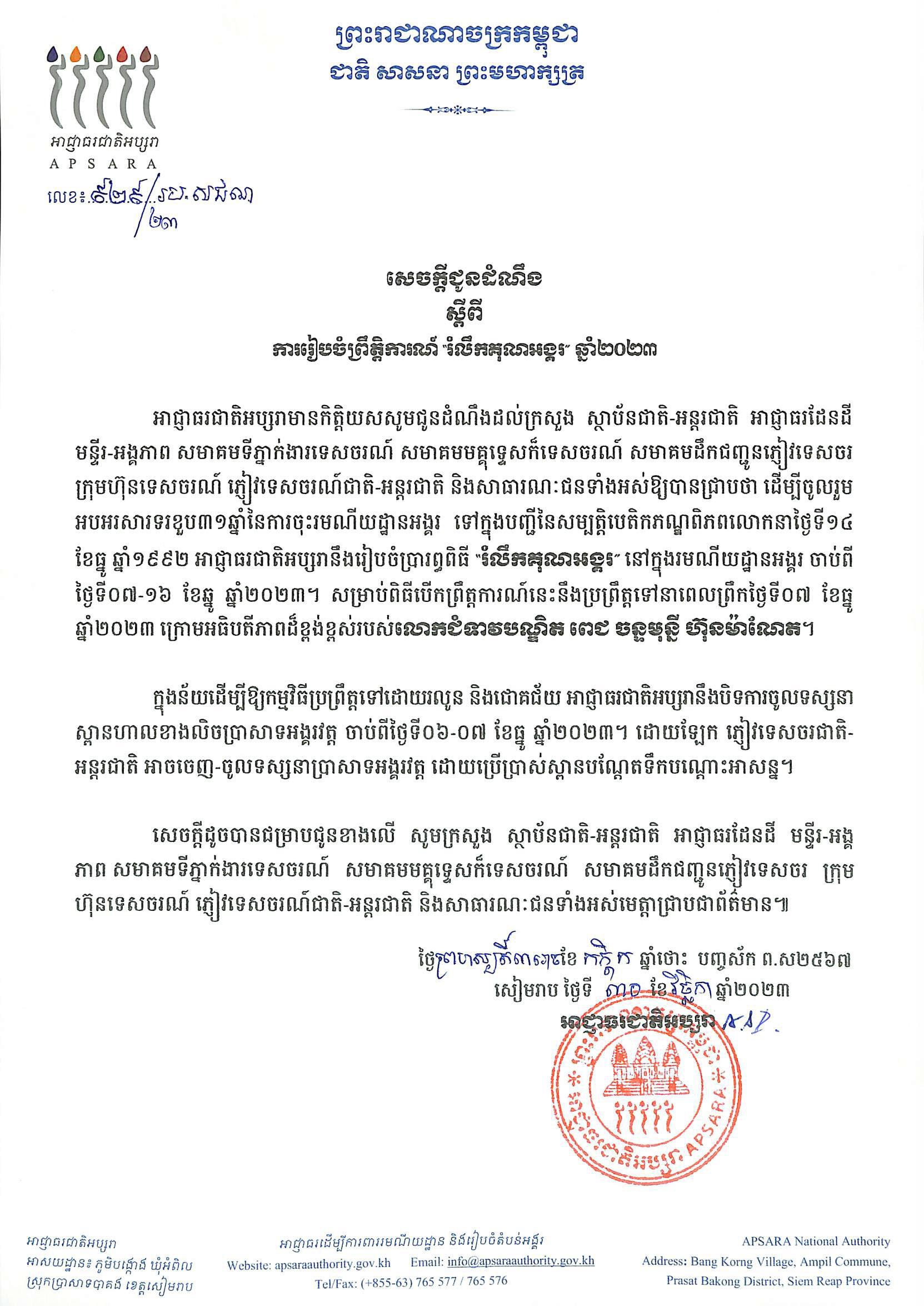 ខេត្តសៀមរាប៖ អាជ្ញាធរជាតិអប្សរា បានចេញសេចក្ដីជូនដំណឹងពីការរៀបចំពិធីរំលឹកគុណអង្គរ នៅរមណីយដ្ឋានអង្គរ ខេត្តសៀមរាប នាថ្ងៃ៧-១៦ ខែធ្នូ ឆ្នាំ២០២៣ ដែលពិធីបើកជាផ្លូវការនឹងប្រព្រឹត្តទៅក្រោមអធិបតីភាព លោកជំទាវបណ្ឌិត ពេជ ចន្ទមុន្នី ហ៊ុនម៉ាណែត។